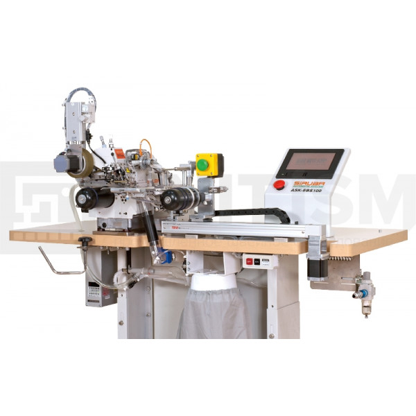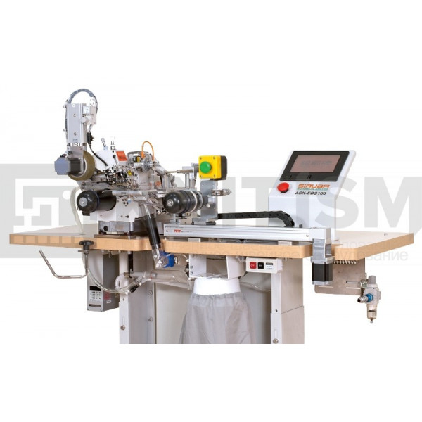 Оснащенное рабочее место на базе 4-х ниточного оверлока с цилиндрической платформой и верхним продвижением 747KST-514M3-24/VT предназначено для притачивания резинки, предварительно сшитой в кольцо, при пошиве шорт и спортивной одежды из лайкры и нейлона.