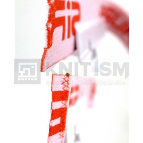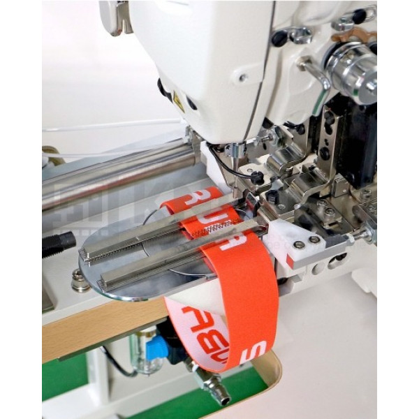 Высокопроизводительный швейный автомат для стачивания резинки в кольцо на базе одноигольной электронной закрепочной машины с автоматической обрезкой нити JUKI LK-1920 (опционально AMS210ENSS) выполняет следующие автоматические операции: подача заготовки, обрезка заготовки заданной длины холодным ножом (опционально - ультразвуковым горячим ножом), стачивание резинки в кольцо закрепкой с заданными параметрами и отведение готового изделия.