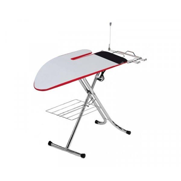 Доска выполнена из оцинкованного металла с эпоксидной эмалью. Гладильная поверхность в виде решётки хорошо подходит для длительной обработки изделий, поскольку пропускает пар и помогает избежать влажных пятен на материале. В конструкции доски предусмотрена дополнительная рукавная консоль для комфортного глажения штанин, рукавов и т.д. Трехслойный чехол, состоящий из войлочной подкладки, поролона и покрытия фиксируется шнурками, обеспечивает отличное скольжение утюга и прилегание материала.
