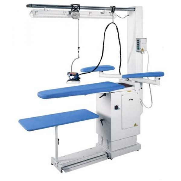 Стол консольный с нагревом, вакуумом и поддувом воздуха. Возможность подключения 2х подогреваемых рукавов. Даёт возможность деликатной обработки всех видов ткани, предотвращает ласы и пролегания. В комплект входит: силиконовая подставка под утюг, антенна, поддерживающая провода. Электрическое подключение 220 В. Мощность нагрева стола 1000 Вт. Мощность вакуума 500 Вт. Размеры рабочей поверхности 118 x 38 x 26.