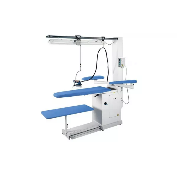 Стол консольный универсальный с регулируемой высотой, отсосом, электрическим подогревом и поддувом воздуха с трубой. Регулировка по высоте, поддув. В комплект входит: силиконовая подставка под утюг, антенна, поддерживающая провода. Электрическое подключение 220 В. Мощность нагрева стола 1000 Вт. Мощность вакуума 500 Вт. Размеры рабочей поверхности 118 x 38 x 26