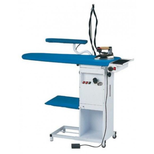 Утюжильный стол консольного типа с подогревом, вакуумным отсосом, встроенным парогенератором и утюгом. Стол 115 х 40 см, подогрев 750 Вт, электро-привод отсоса 150 Вт; бойлер 3,5 л., 1300 Вт, рабочее давление 2,8 bar; утюг 850 Вт, 1,5 кг.(1,7 кг). Поворотный рукав BF075 приобретается отдельно.