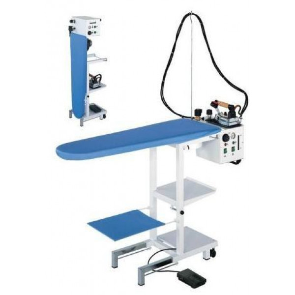 Стол гладильный марки Comel с парогенератором, универсальный, складной, с отсосом и электрическим подогревом. Регулировка температуры стола при помощи термостата, имеется встроенное отсасывающее устройство. Комплект состоит из бойлера ёмкостью 1,5 литрa с аварийным клапаном, силиконовой подставки под утюг, электроклапана для регулировки пара, а также антенны, поддерживающей провода. Мощность 1,6кВт. Рабочее давление 2,5 бар. Размер стола 113 x 38 x 26 См