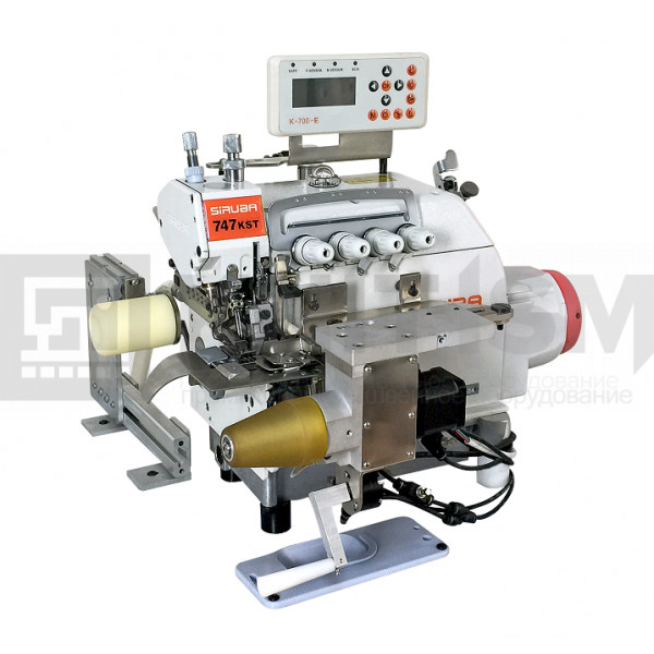 Автоматизированная рабочая станция на базе краеобметочной машины с цилиндрической платформой и верхним продвижением 747KST с пневматическим фиксатором краев и роликами натяжения резины с функцией автоматического позиционирования тесьмы. Предназначен для выполнения операции втачивания горловины.