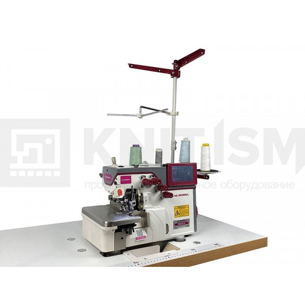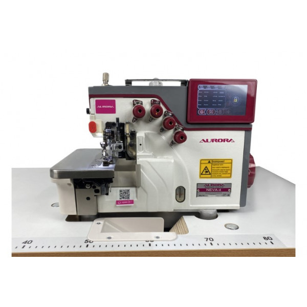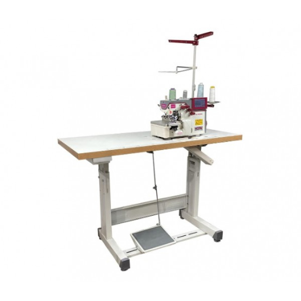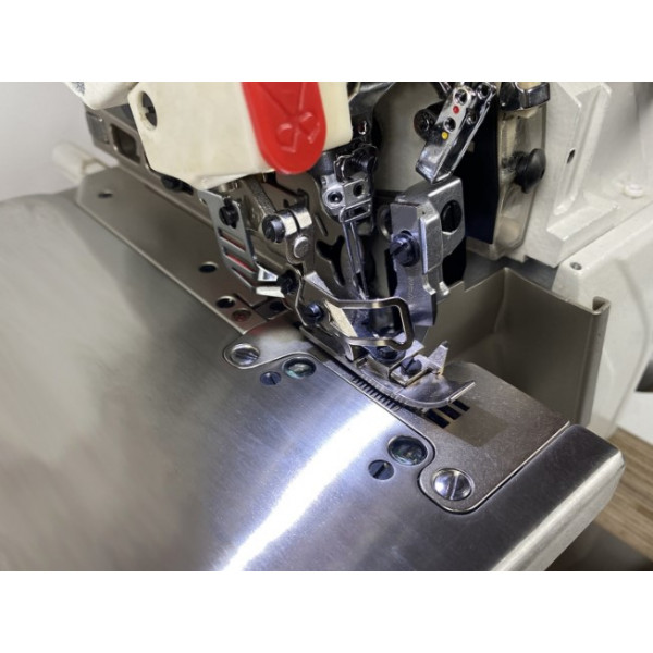 Автоматизированный высокоскоростная четырехниточная двухигольная стачивающе-обметочная машина (4-х ниточный оверлок) с автоматическим подъемом лапки и автоматический обрезчик ленты / цепочки нити, прямым сервоприводом, регулировкой скорости и позиционированием иглы, сенсорной панелью управления и звуковым сопровождением на РУССКОМ языке.