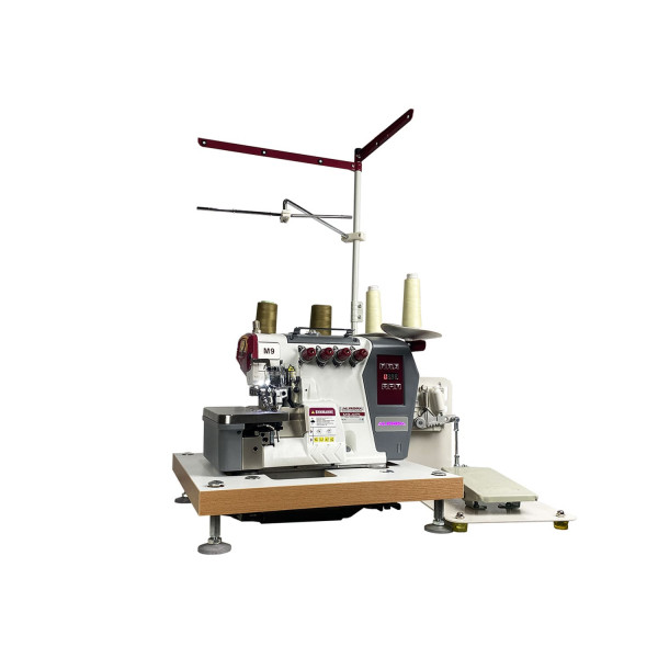 Соввременная портативная высокоскоростная четырехниточная двухигольная стачивающе-обметочная машина (4-х ниточный оверлок) с автоматическим подьемом лапки, прямым сервоприводом, регулировкой скорости и позиционированием иглы, предназначен для обметывания цепным стежком краев деталей швейных изделий из легких и средних материалов.