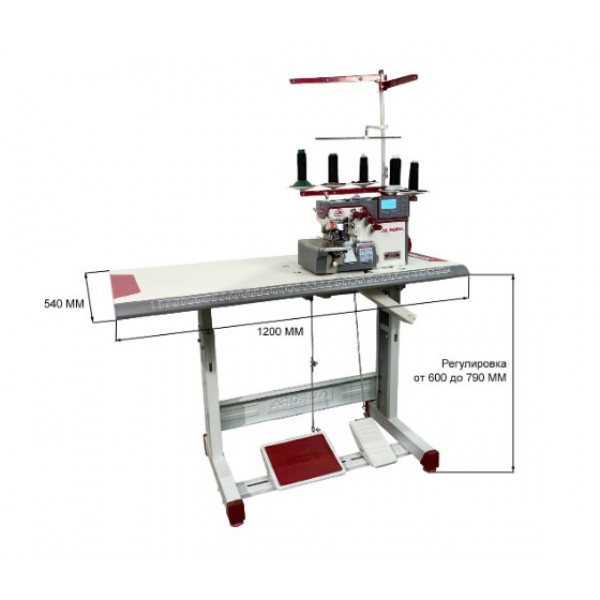Промышленный двухигольный пятиниточный оверлок со встроенным мотором, автоматическим подъемом лапки, автоматическим началом и окончанием шитья, автоматической обрезкой нити. Предназначен для производства джинс, спецодежды, мебельных чехлов, рабочей одежды и т.д.