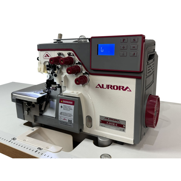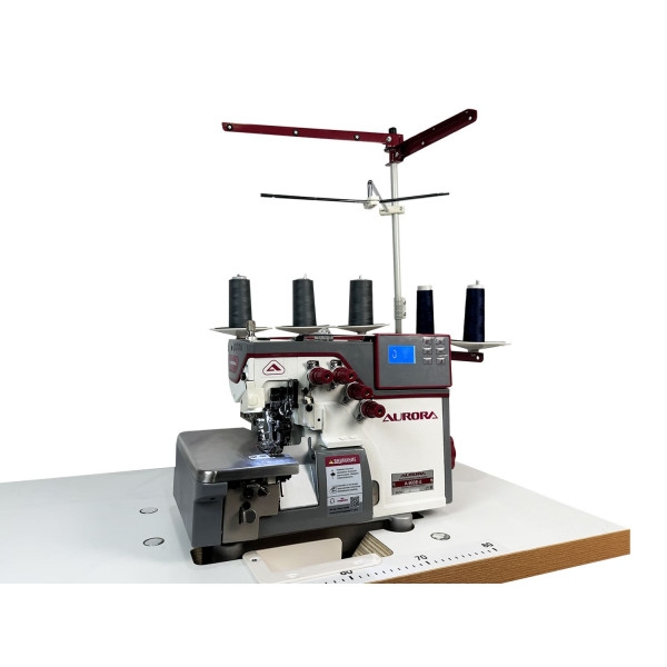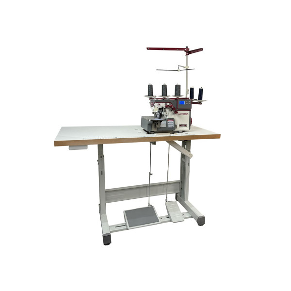 Пятиниточная двухигольная стачивающе-обметочная машина со встроенным мотором, регулировкой скорости и позиционированием иглы.