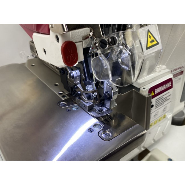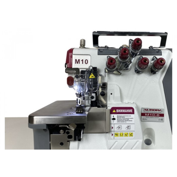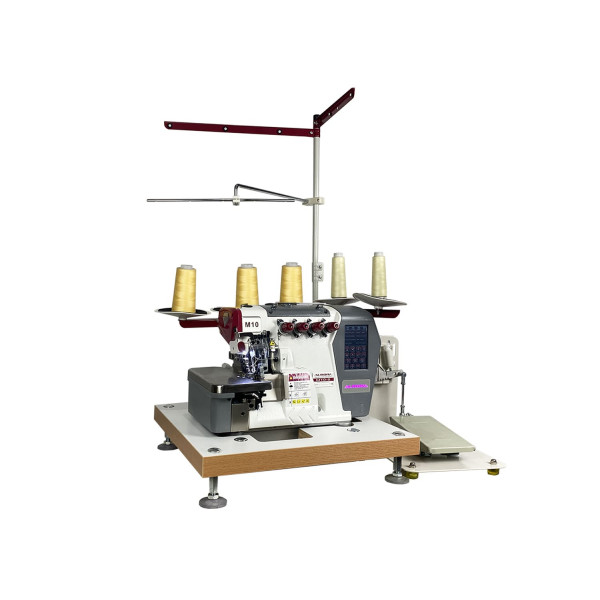 Современная портативная автоматизированная высокоскоростная шестиниточная трехигольная стачивающе-обметочная машина (6-ти ниточный оверлок) с автоматическим подъемом лапки и автоматический обрезчик ленты / цепочки нити за счет шагового двигателя, прямым сервоприводом, регулировкой скорости и позиционированием иглы, предназначен для обметывания цепным стежком краев деталей швейных изделий из легких и средних материалов.