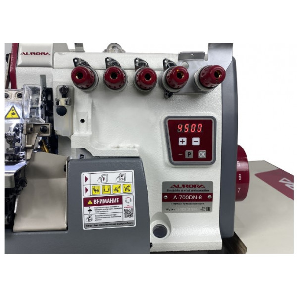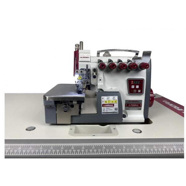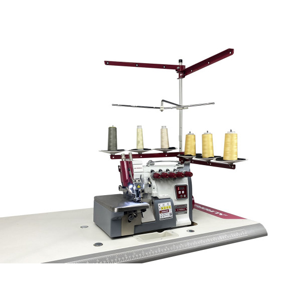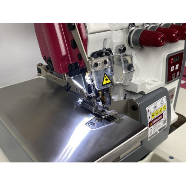 Шестиниточная трехигольная стачивающе-обметочная машина со встроенным мотором, регулировкой скорости и позиционированием иглы для изделий из легких и средних материалов.