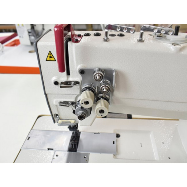 Двухигольная промышленная швейная машина челночного стежка со встроенным энергосберегающим мотором. Предназначена для шитья лёгких и средних материалов двумя параллельными строчками, незаменима при выполнении отделочной строчки. Используется для производства нижнего белья, плащей, рубашек, курток, джинсов и другой одежды. Прямой привод обеспечивает плавный пуск, низкий уровень шума и значительную (до 40%) экономию энергии.