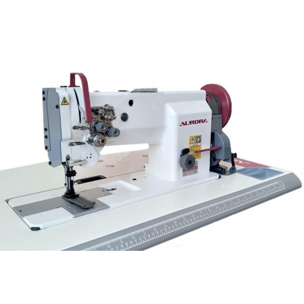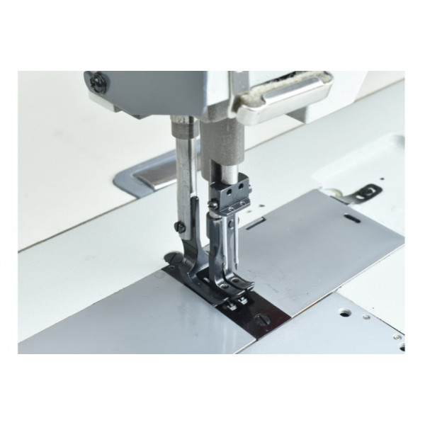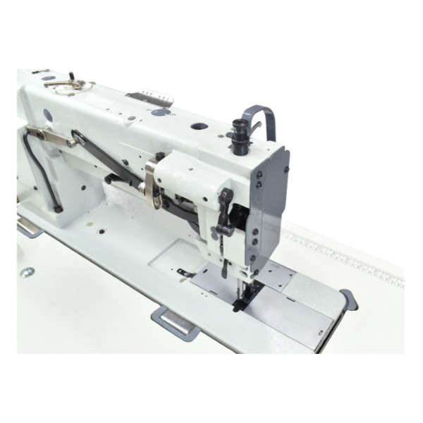 Двухигольная машина челночного стежка с тройным (унисонным) продвижением, увеличенным вылетом рукава и увеличенными вертикальными челноками. Длиннорукавные машины с вылетом рукава 760, 1005 мм укомплектованы автоматическим подъемом лапки и автоматической закрепкой пневматического типа. Рядом с игловодителем выведена клавиша закрепки. На эту клавишу также вывести функцию подъема лапки. Машина предназначена для шитья тяжелых материалов двумя параллельными строчками при изготовлении тентов, палаток и мебельных чехлов.