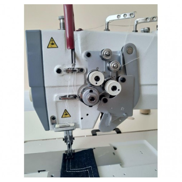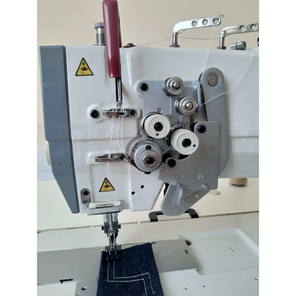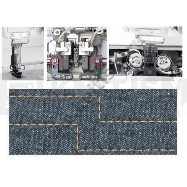 Машина предназначена для шитья средних и тяжелых материалов двумя параллельными строчками, незаменима при выполнении отделочной строчки на клапанах карманов, манжетах и поясах, механизм отключения игл дает возможность правой или левой игле останавливаться независимо от другой простым движением рычага, что обеспечивает простоту и удобство выполнения отделочных строчек на углах.