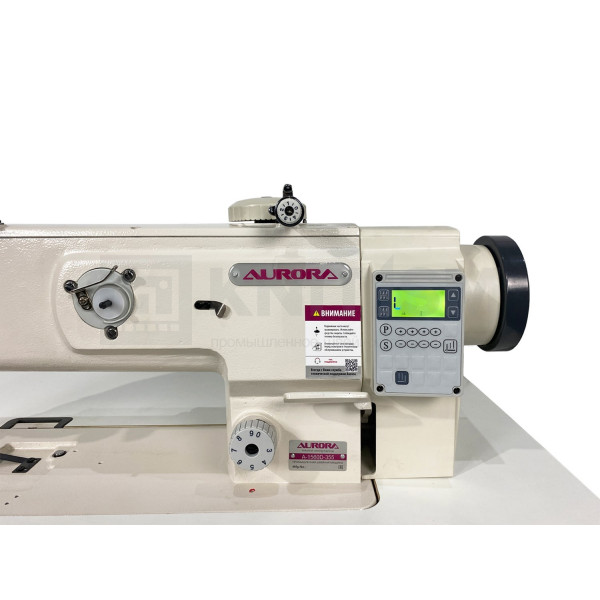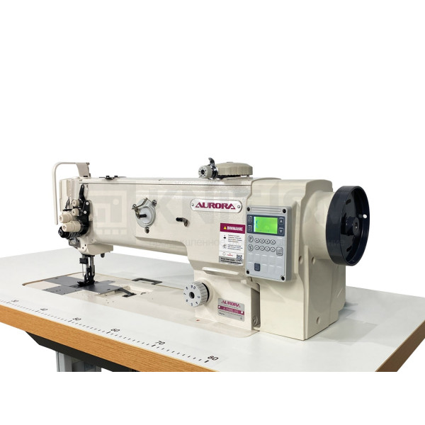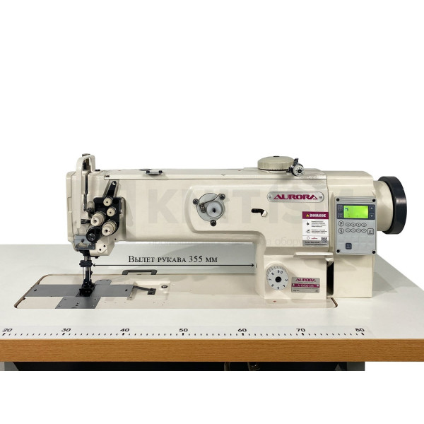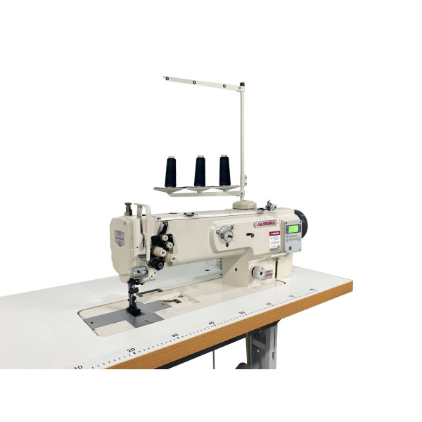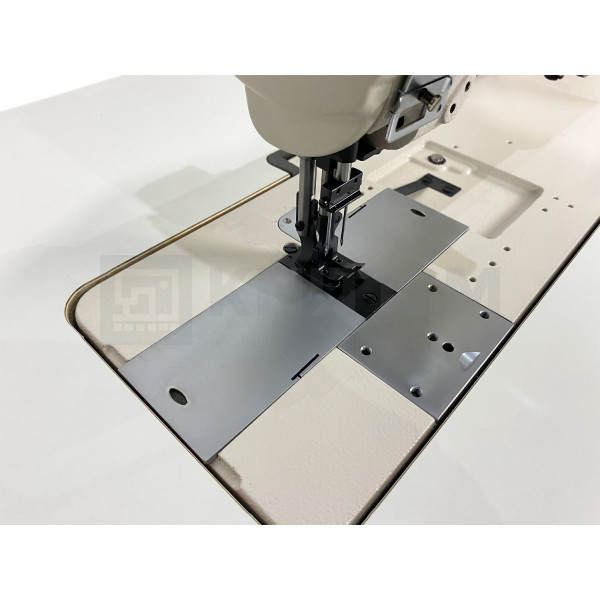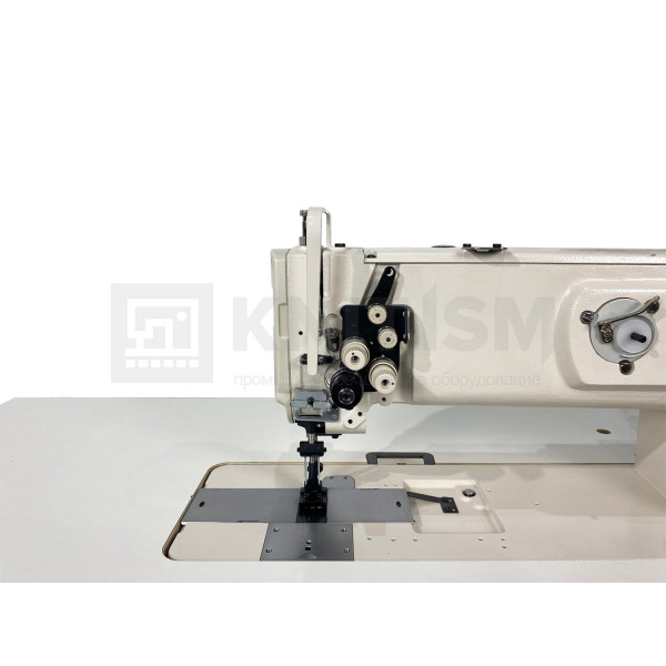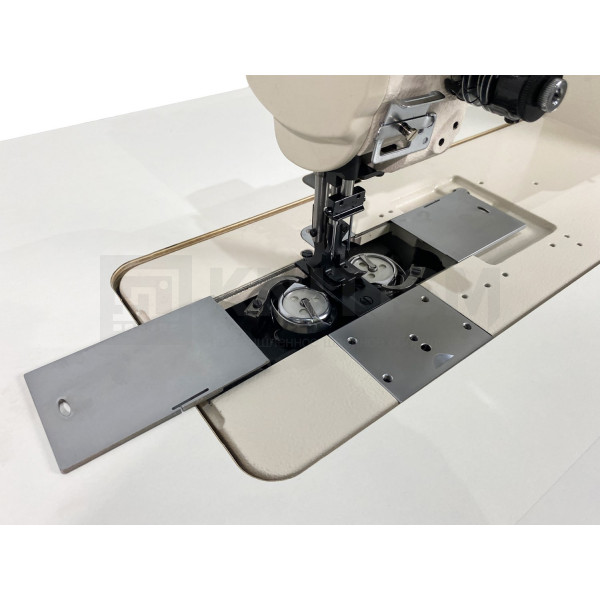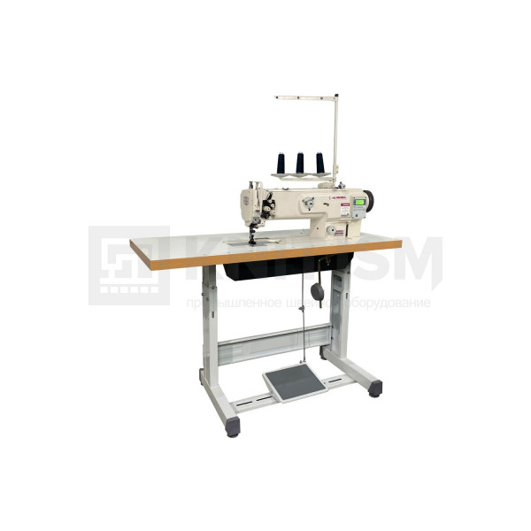 Двухигольная машина челночного стежка с тройным (унисонным) продвижением, увеличенным рабочим пространством, прямым приводом и вертикальными увеличенными челноками для тяжелых материалов. Машина предназначена для шитья тяжелых материалов двумя параллельными строчками. Имеет позиционер иглы. Вылет рукава 355 мм.