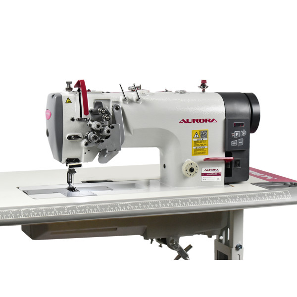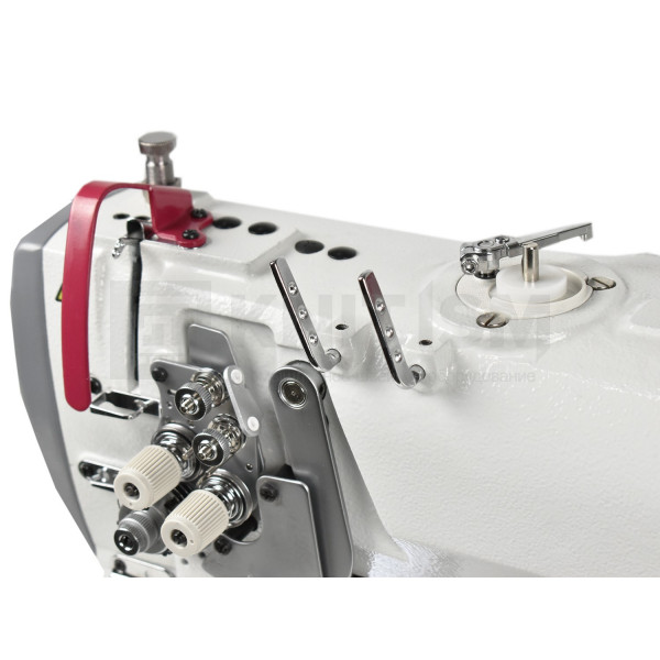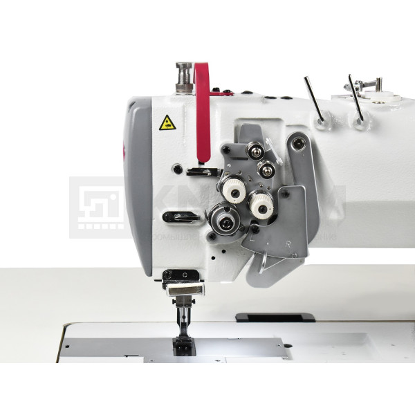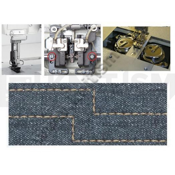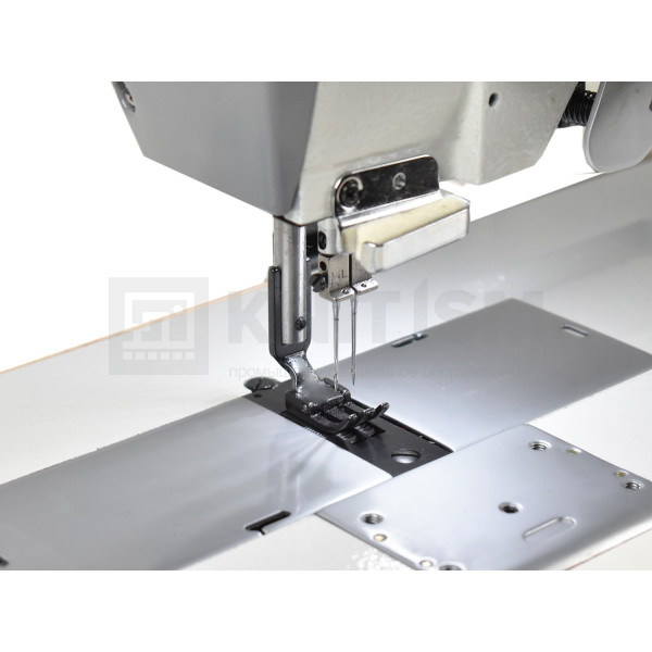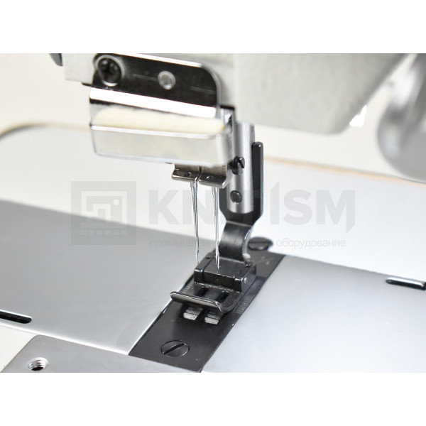 Двухигольная промышленная швейная машина челночного стежка с игольным продвижением и механизмом отключения одной из игл и встроенным энергосберегающим мотором. Предназначена для шитья средних и тяжелых материалов двумя параллельными строчками, незаменима для выполнения отделочной строчки. Используется для производства джинсов, пуховиков, сидений, палаток и обуви. Возможность пошагового шитья и позиционирование иглы расширяют сферу применения машины. Прямой привод обеспечивает плавный пуск, низкий уровень шума и значительную (до 40%) экономию энергии.