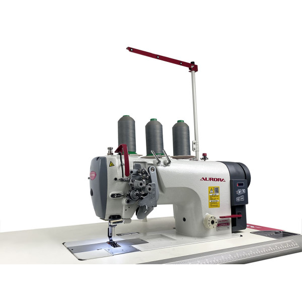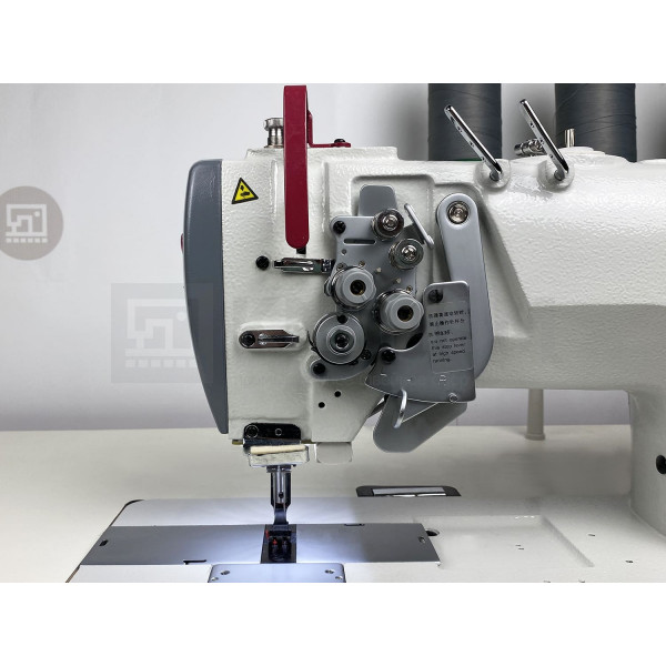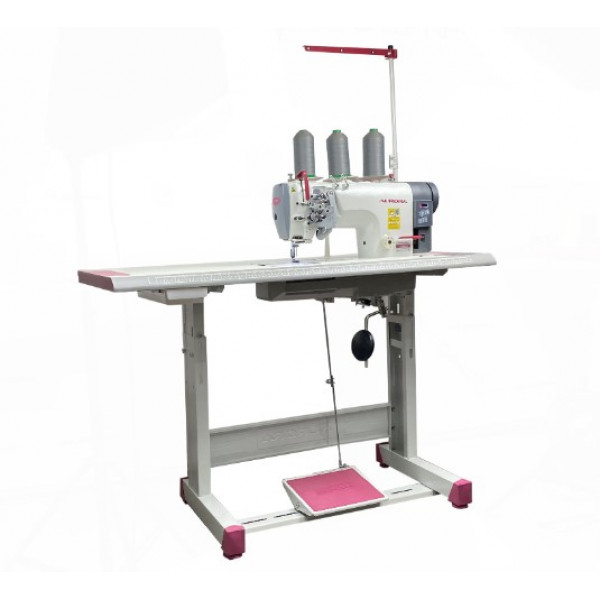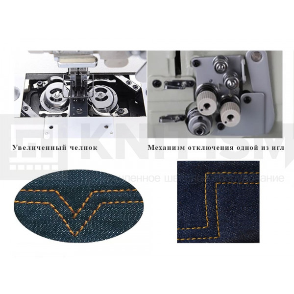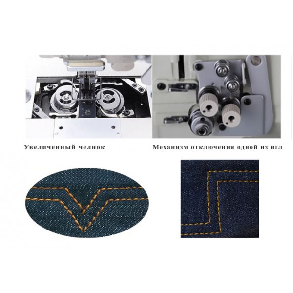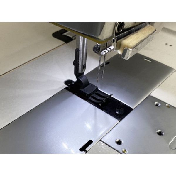 Двухигольная промышленная швейная машина челночного стежка с игольным продвижением, механизмом отключения одной из игл, увеличенным челноком и встроенным энергосберегающим мотором. Предназначена для шитья тяжелых материалов двумя параллельными строчками. Незаменима при выполнении отделочной строчки на клапанах карманов, манжетах и поясах. Возможность пошагового шитья и позиционирование иглы расширяют сферу применения машины. Прямой привод обеспечивает плавный пуск, низкий уровень шума и значительную (до 40%) экономию энергии.