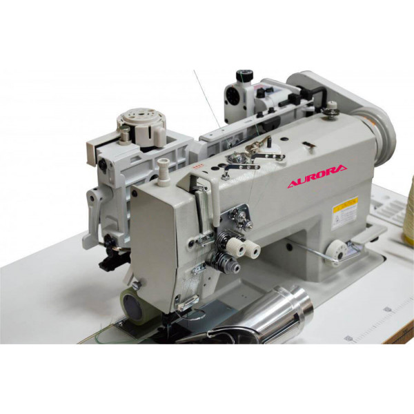 Двухигольная машина челночного стежка с игольным продвижением и увеличенными челноками. Межигольное расстояние 46 мм. Установленная конструкция позволяет за одну операцию придать необходимую форму поясу (при помощи приспособления — улитки, размер которой подбирается под заданную ширину пояса) и притачать его к изделию. Задний пуллер создает усиленное продвижение готового изделия. Механизм отключения игл отсутствует.