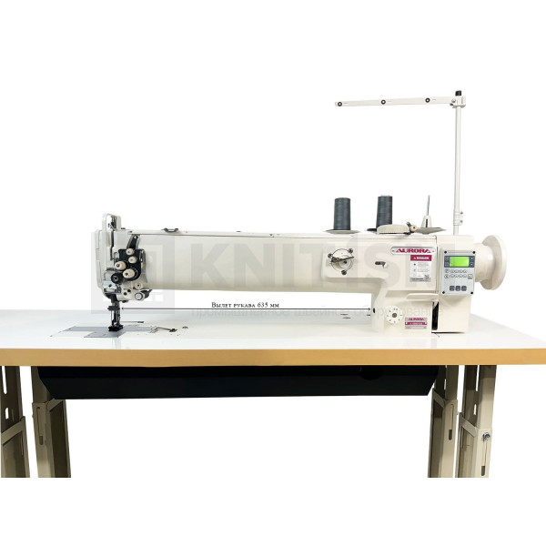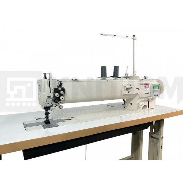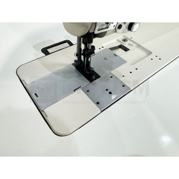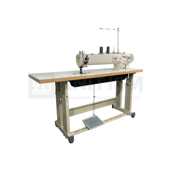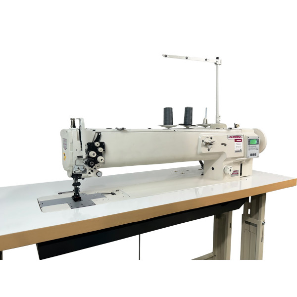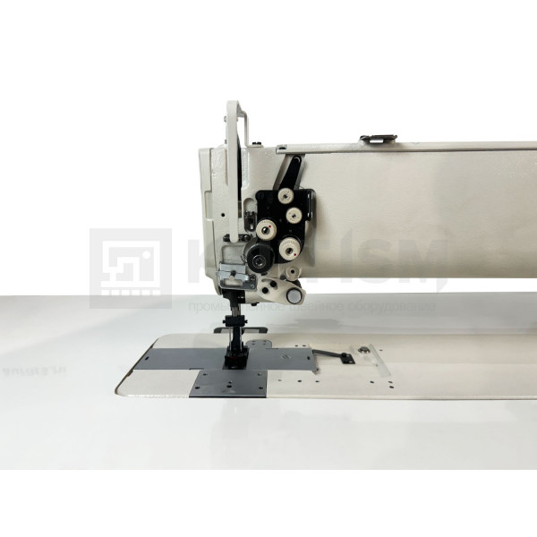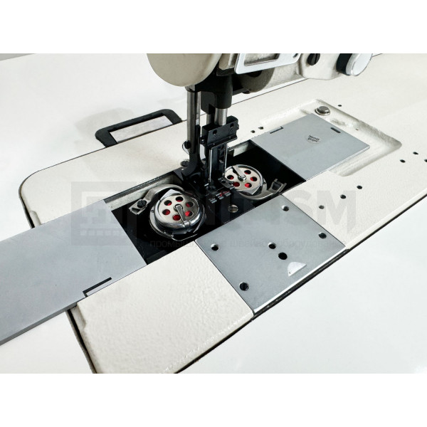 Двухигольная машина челночного стежка с тройным (унисонным) продвижением, увеличенным рабочим пространством, прямым приводом и вертикальными увеличенными челноками для тяжелых материалов. Машина предназначена для шитья тяжелых материалов двумя параллельными строчками. Имеет позиционер иглы. Вылет рукава 635 мм.