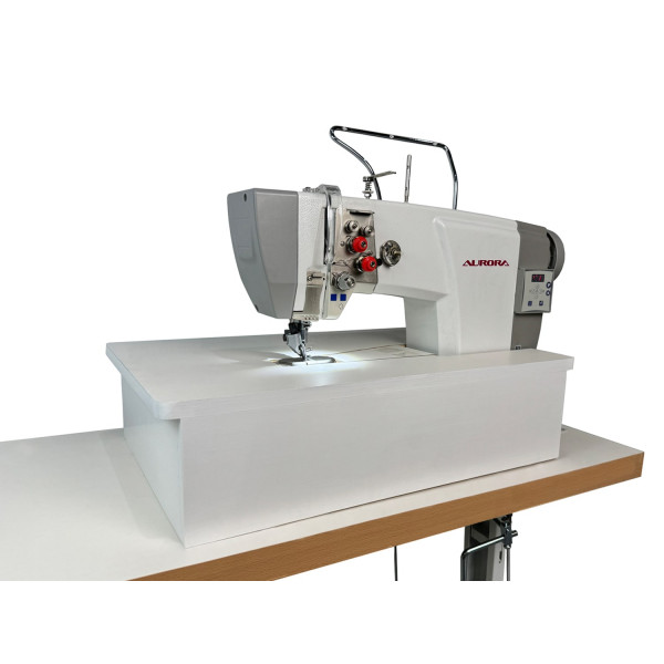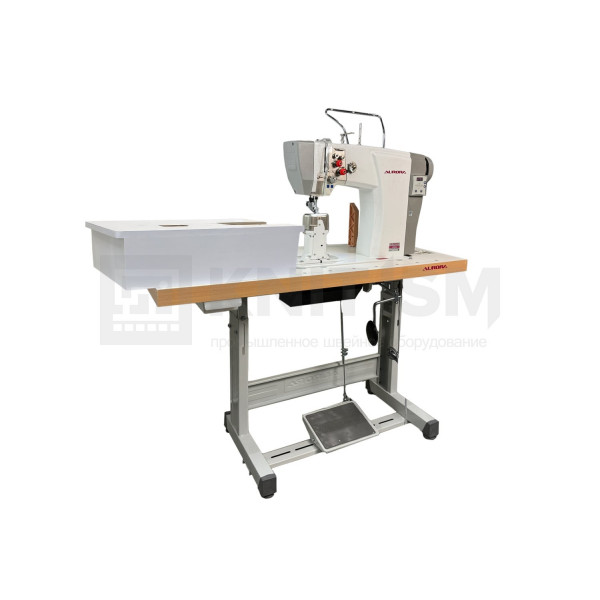 Универсальная одноигольная/двухигольная колонковая машина челночного стежка с роликовым продвижением, прямым приводом, увеличенными челноками и специальным удобным столом для работы с плоскими заготовками различных изделий из тяжелых материалов, натуральной и искусственной кожи при изготовлении сумок, обуви и кожгалантереи.