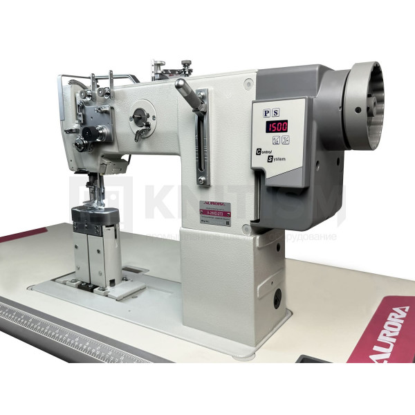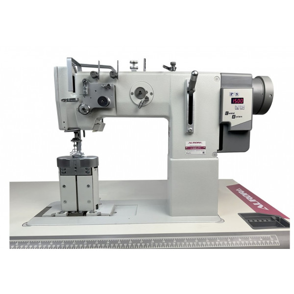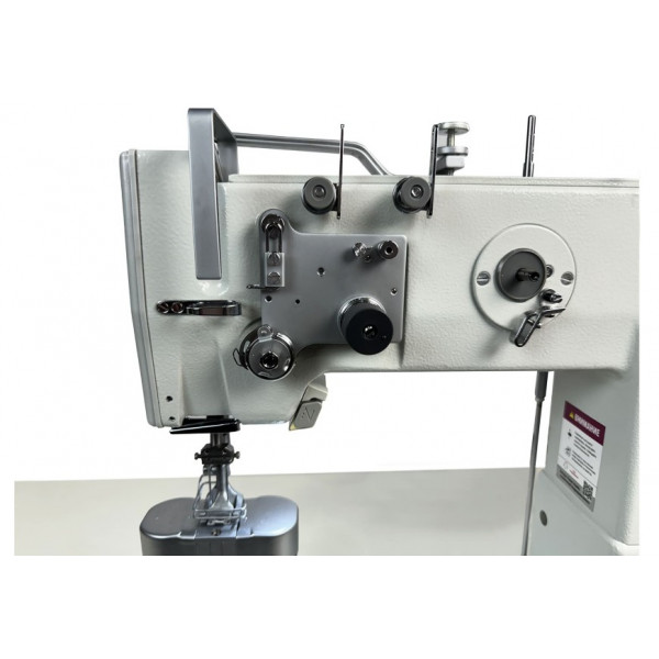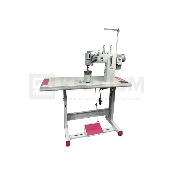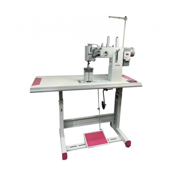 Двухигольная колонковая машина челночного стежка с тройным продвижением выполняет красивые декоративные строчки на выгнутых участках и предназначена для шитья тяжелых материалов и кожи при изготовлении подголовников и подлокотников автомобильных сидений, а также мягкой мебели и спортивных товаров. Прямой привод.