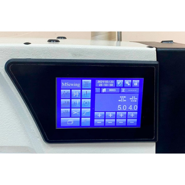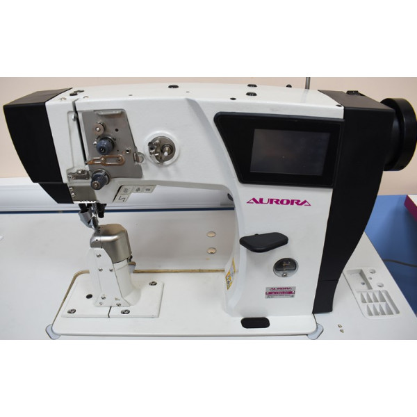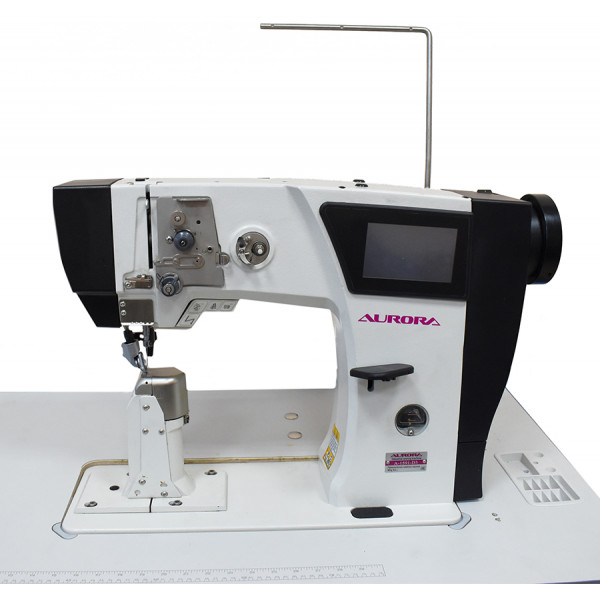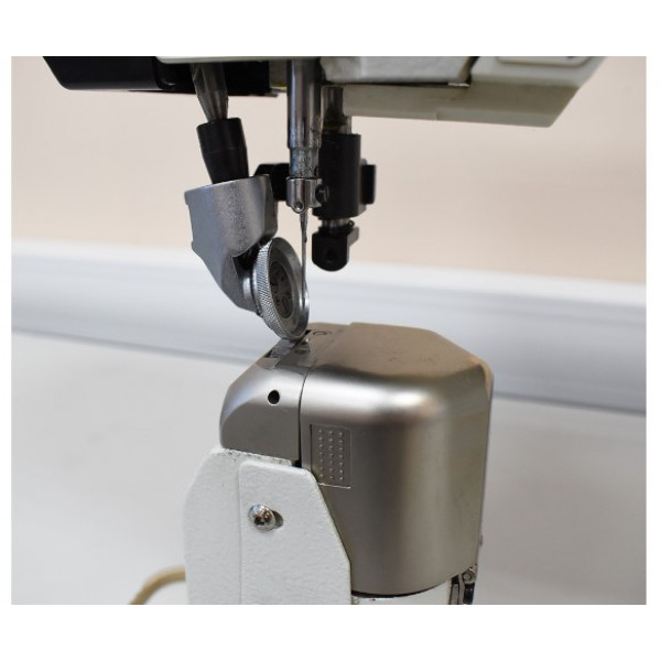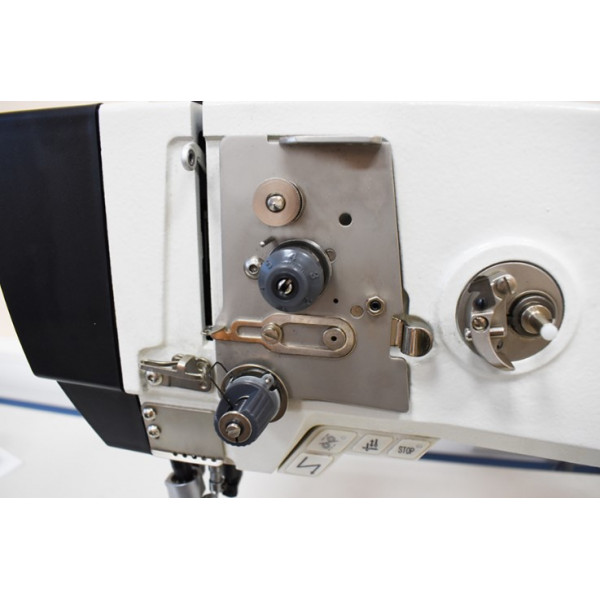 Одноигольная колонковая машина челночного стежка с прямым приводом, автоматической обрезкой нити (минимальная длина остатков нити), закрепкой нити и автоматическим подъемом лапки, позиционером иглы и возможностью программирования количества стежков в строчке.