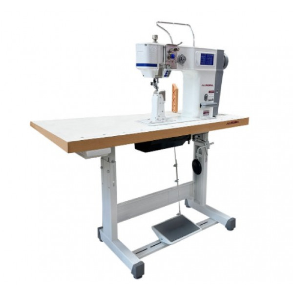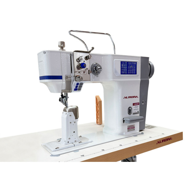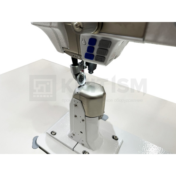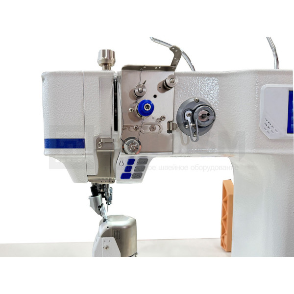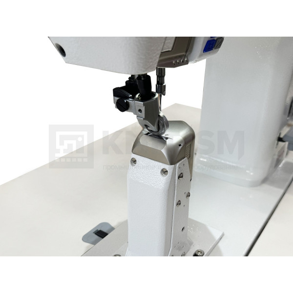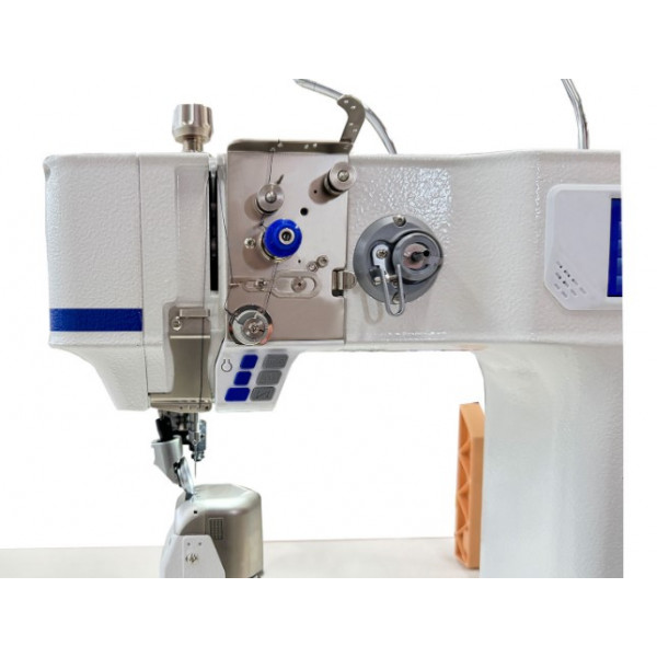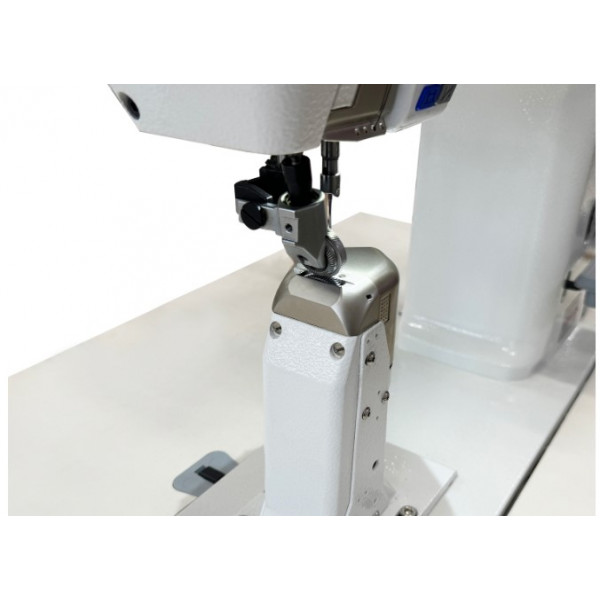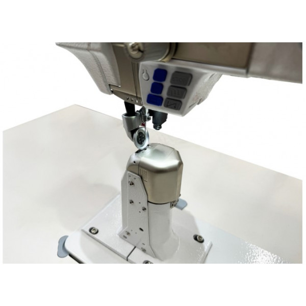 Одноигольная колонковая машина челночного стежка с верхней и нижней роликовой подачей и игольным продвижением, прямым приводом, автоматической обрезкой нити, закрепкой нити и автоматическим подъемом лапки и позиционером иглы.