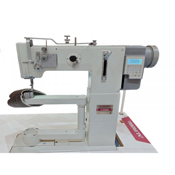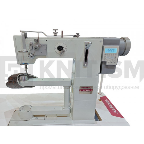 Одноигольная колонковая машина челночного стежка с высокой вращающейся платформой, тройным (унисонным) продвижением, прямым приводом, позиционером иглы и увеличенным челноком.