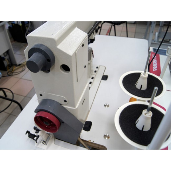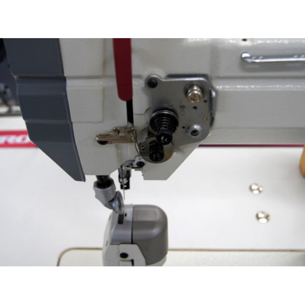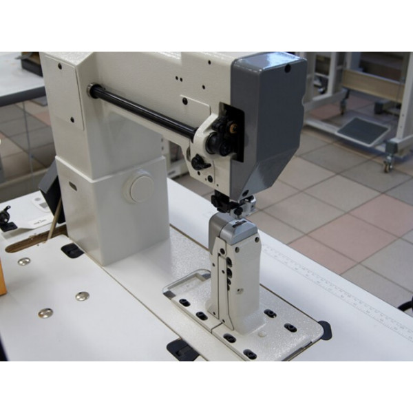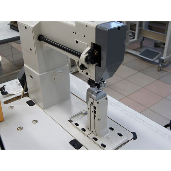 Одноигольная колонковая машина челночного стежка с унисонной подачей верхнего и нижнего ролика и иглы. Машина предназначена для шитья тяжелых материалов и кожи при изготовлении сумок, обуви, кожгалантереи. Система подачи ткани состоит из прижимного ролика, гребенки продвижения роликового типа и отклоняющегося игловодителя.