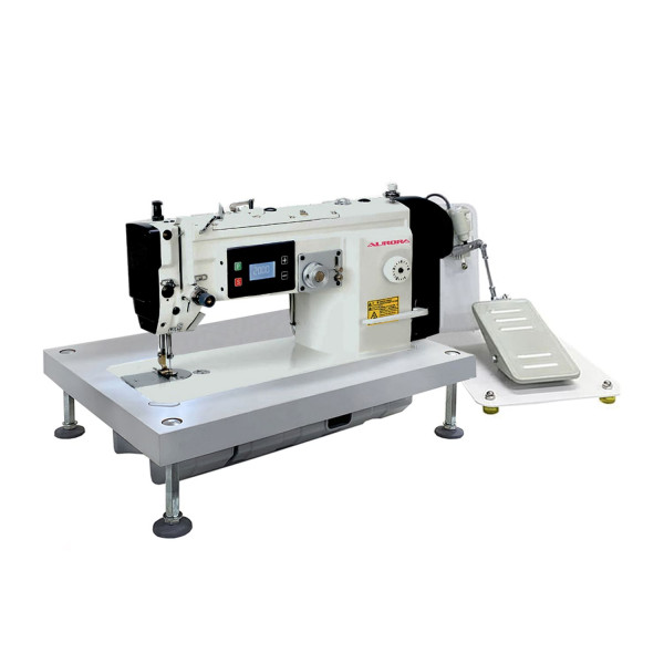 Одноигольная машина челночного стежка строчки зиг-заг (двухукольный одношаговый) с нижним продвижением, увеличенным челноком, прямым приводом.