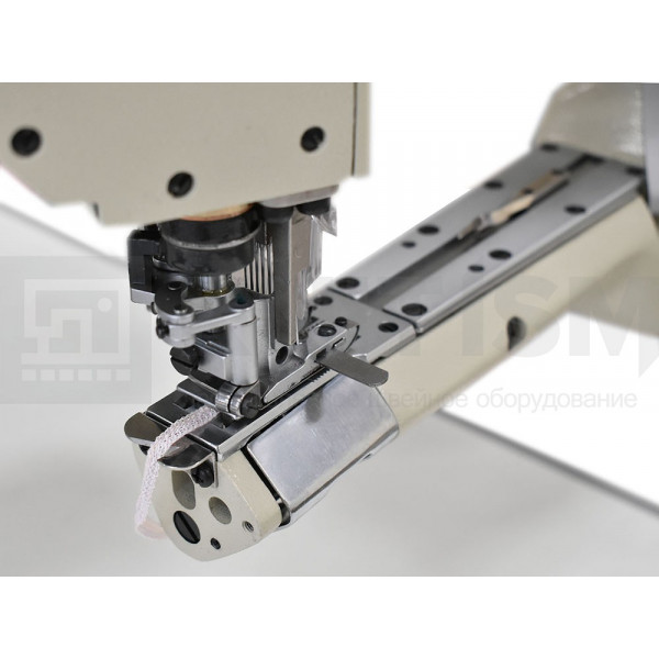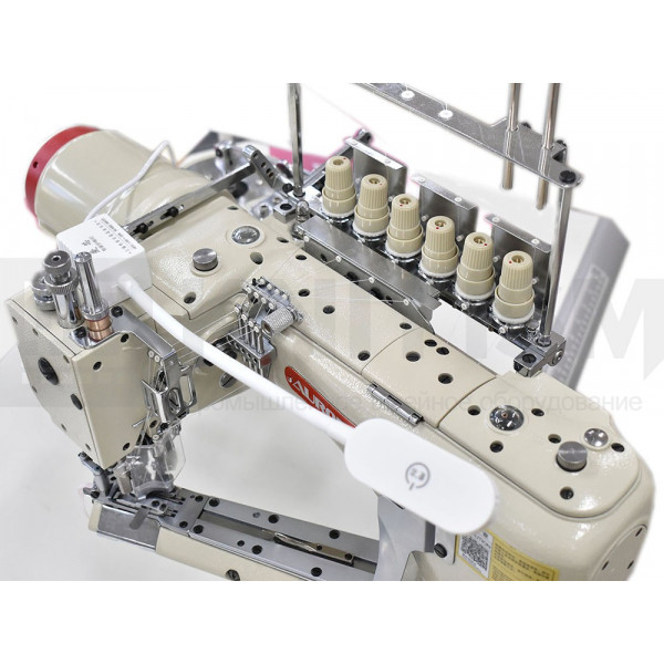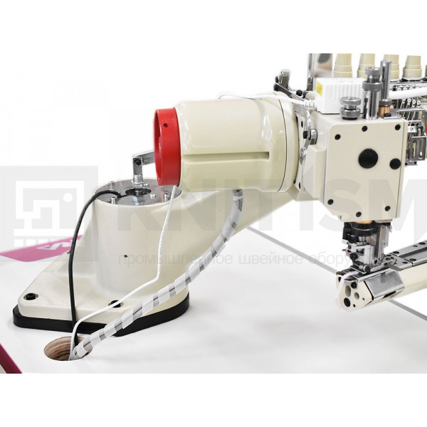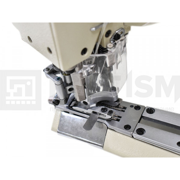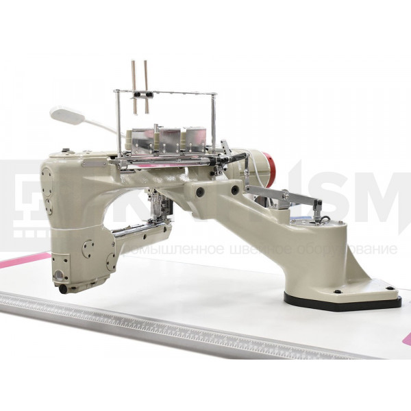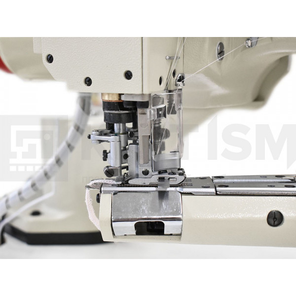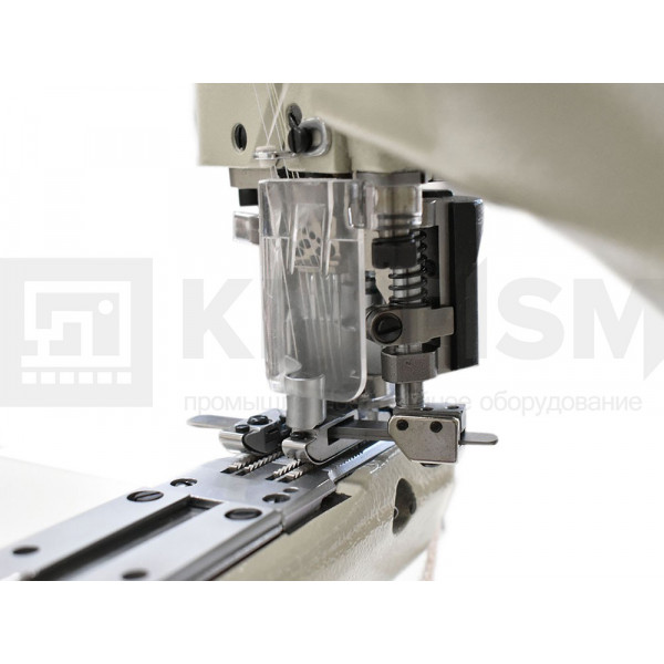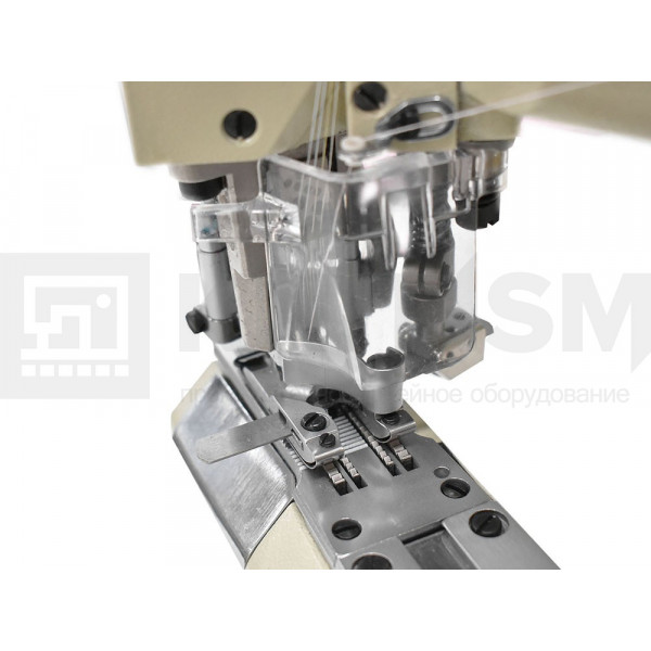 Четырехигольная шестиниточная плоскошовная машина со свободным рукавом (Flatlock), прямым приводом, двухсторонней обрезкой края материала, вытяжкой обрезков ткани (центрифуга) и устройством автоматического подъема лапки электромагнитного типа. Механизм дифференциальной подачи материала с возможностью тонкой регулировки хода реек. Регулировка коэффициента дифференциальной подачи может выполняться непосредственно во время работы с помощью рычага.