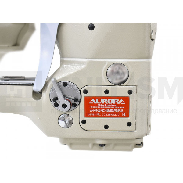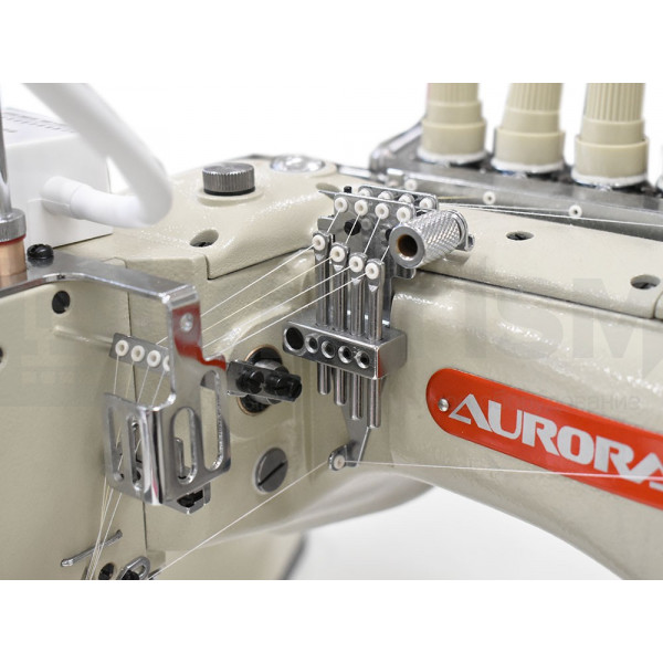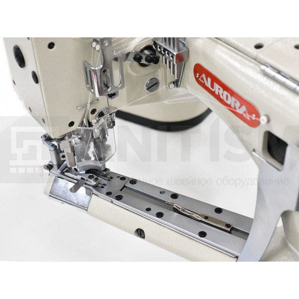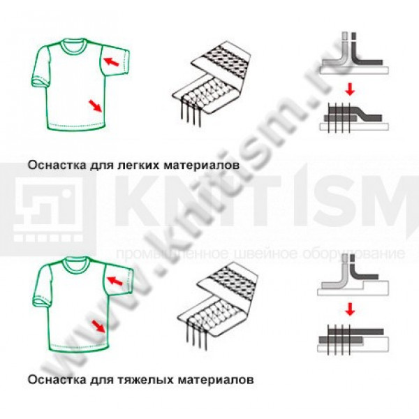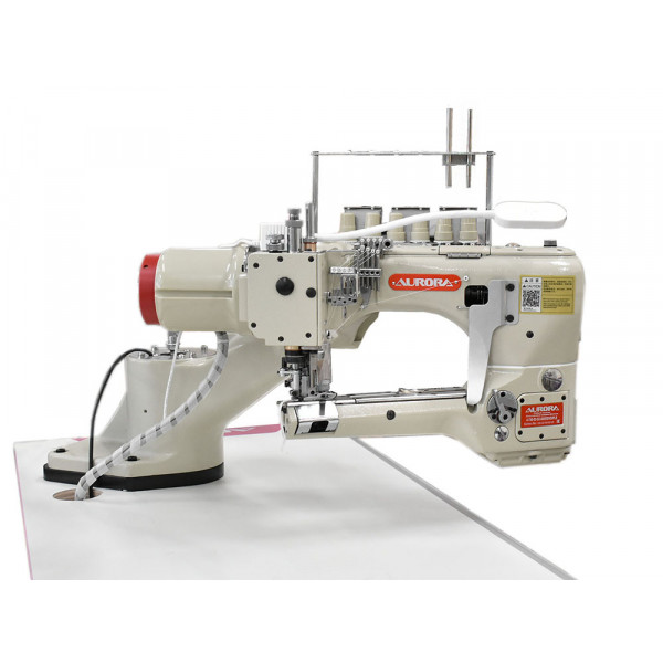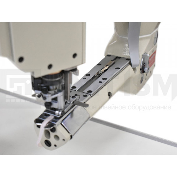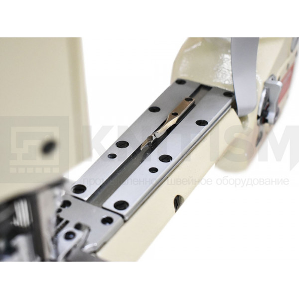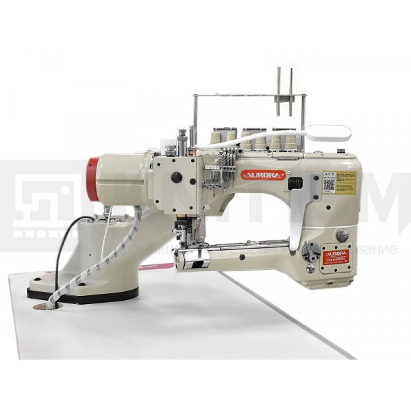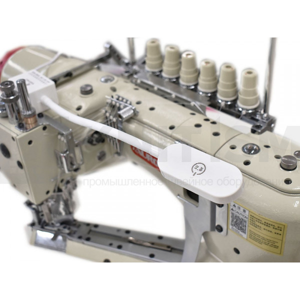 Четырехигольная шестиниточная плоскошовная машина со свободным рукавом (Flatlock), прямым приводом, двухсторонней обрезкой края материала, вытяжкой обрезков ткани (центрифуга) и устройством автоматического подъема лапки электромагнитного типа. Механизм дифференциальной подачи материала с возможностью тонкой регулировки хода реек. Регулировка коэффициента дифференциальной подачи может выполняться непосредственно во время работы с помощью рычага.