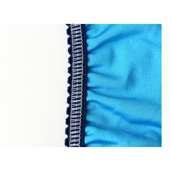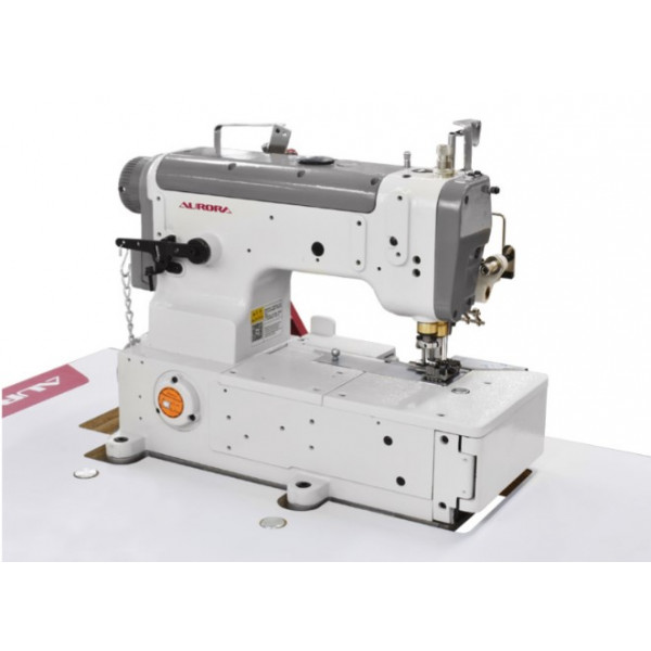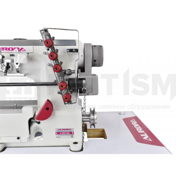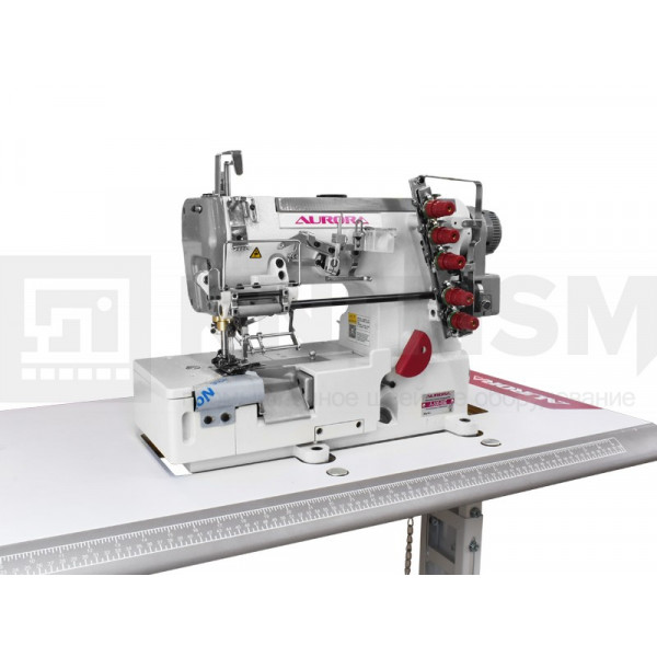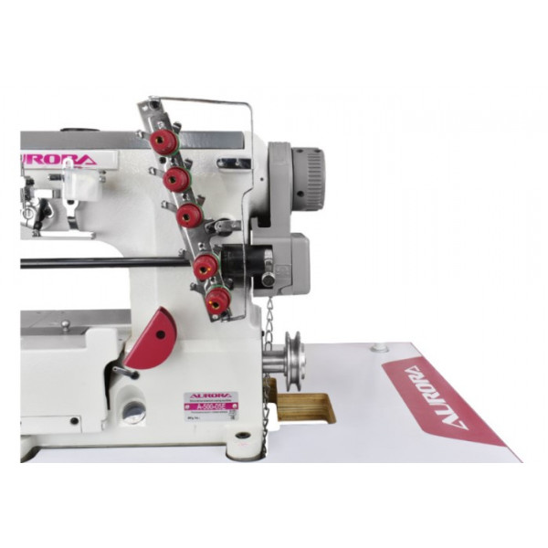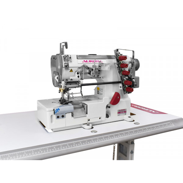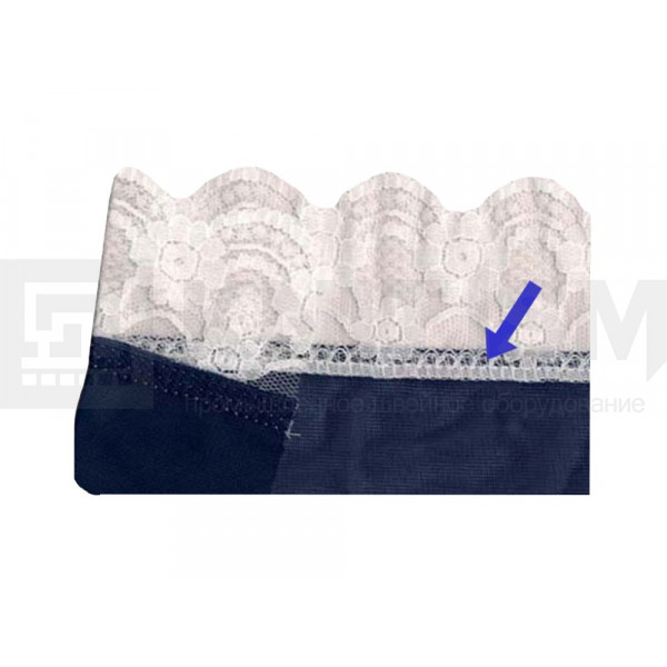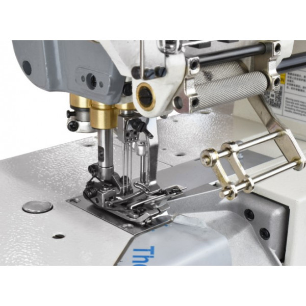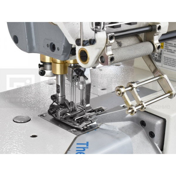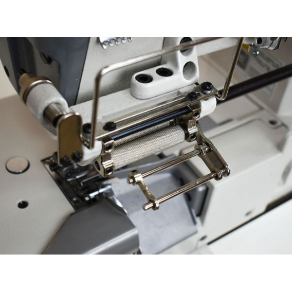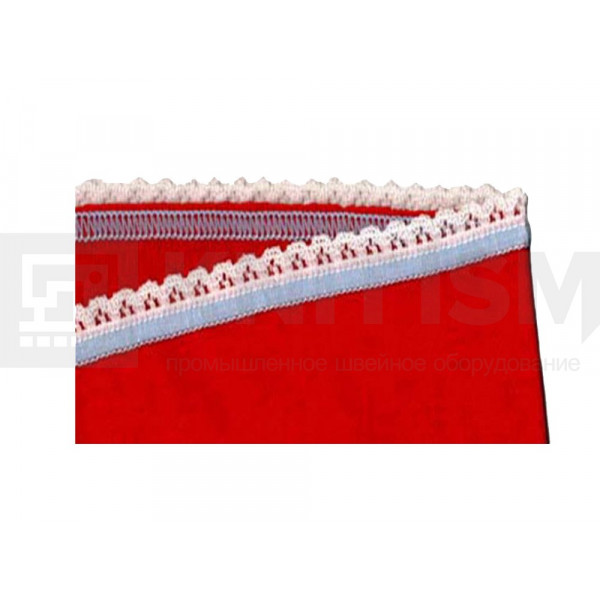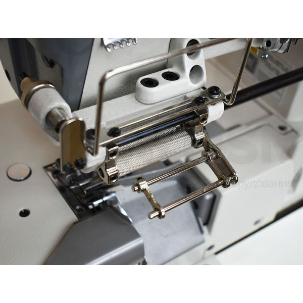 Трехигольная пятиниточная плоскошовная машина с верхним раскладчиком нити, механическим приспособлением для дозированной подачи эластичной тесьмы и правосторонним ножом обрезки края материала. Предназначена втачивания тесьмы или настрачивания эластичной ленты при пошиве трикотажной и спортивной одежды: брюк, футболок и нижнего белья.