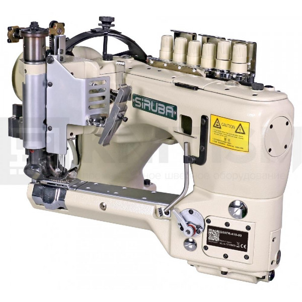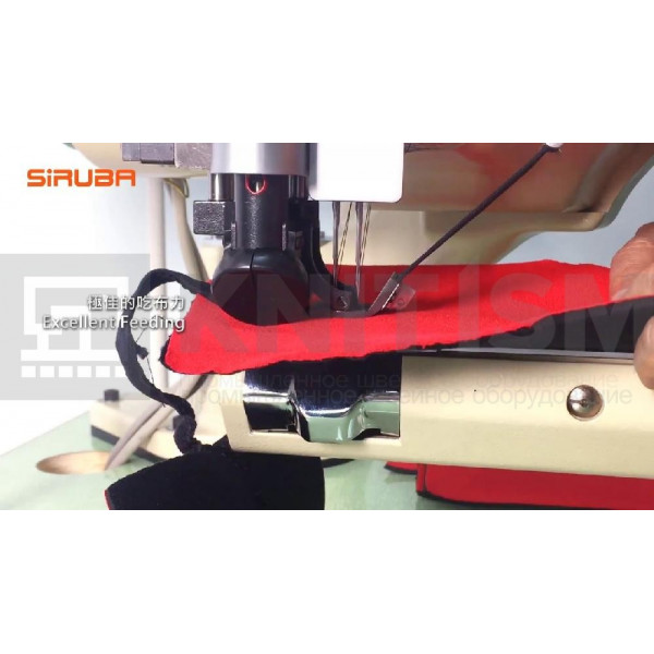 Шестиниточный флетлок со свободным рукавом с прямым приводом, приспособлением для настрачивания ленты поверх шва и задним роликом для лучшего продвижения материала предназначен для стачивания швов и деталей из неопрена и пр. материалов, используемых при пошиве гидрокостюмов.