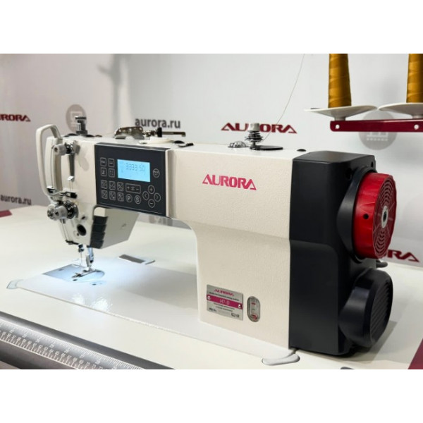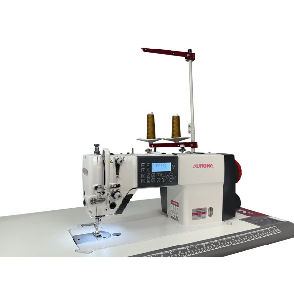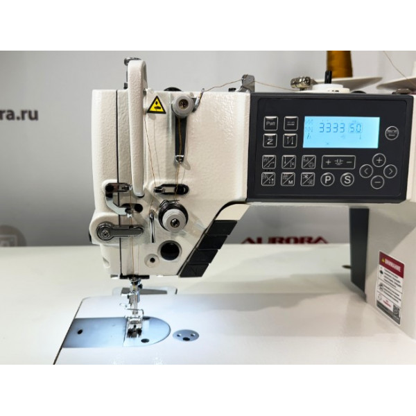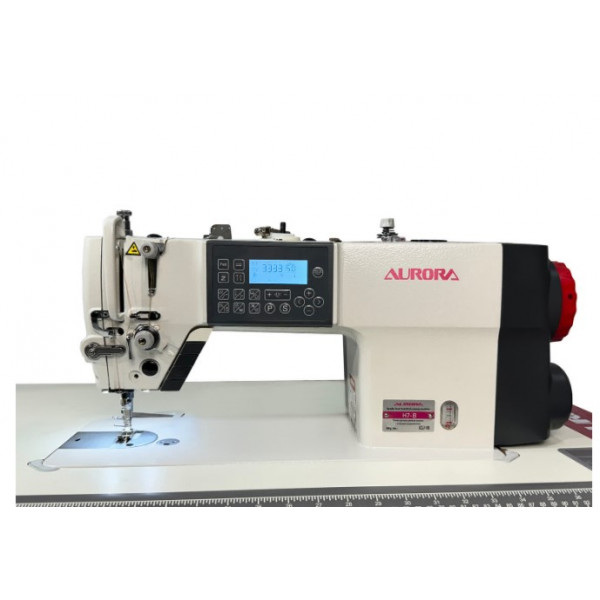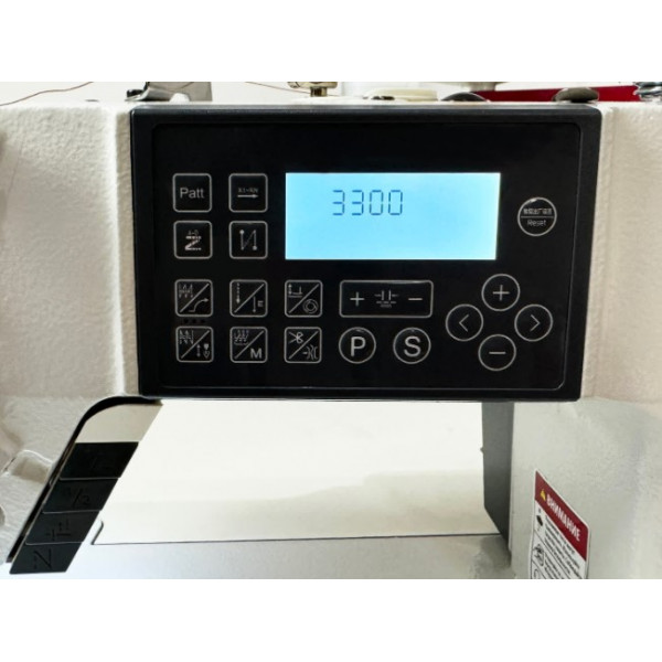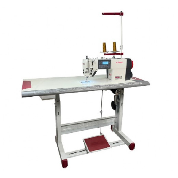 Одноигольная прямострочная машина челночного стежка с игольным продвижением, увеличенным челноком, закрытой системой смазки, автоматической закрепкой нити и возможностью программирования количества стежков в строчке, двумя шаговыми моторами: один отвечает за электронную длину стежка, автоматическую обрезку нити с двумя подвижными ножами и подъем лапки, второй - основной, отвечает за скорость шить и позиционирование иглы.