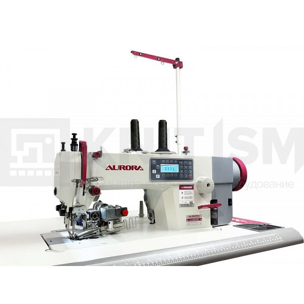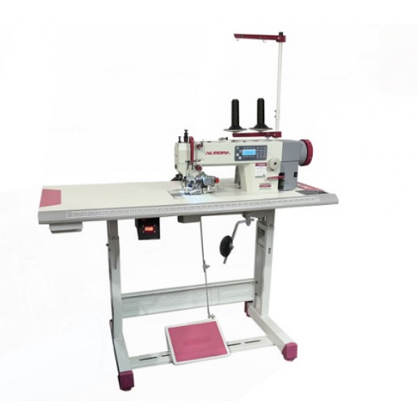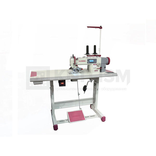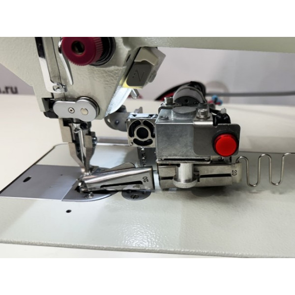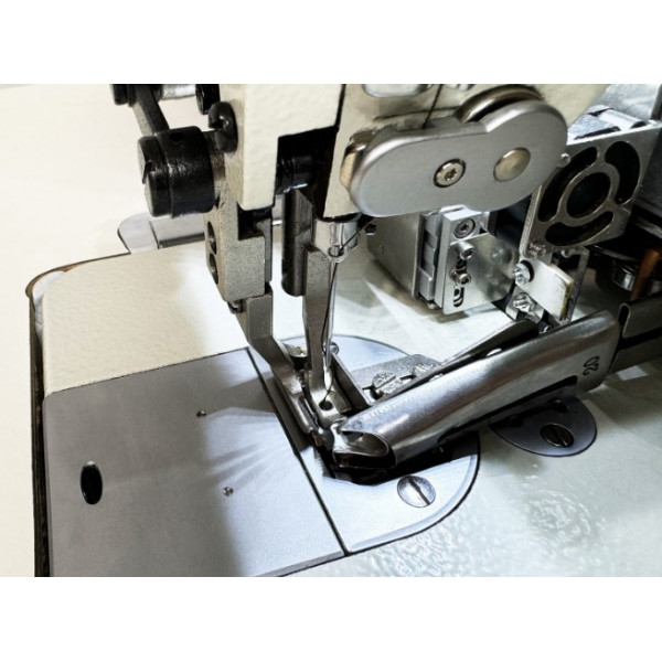 Одноигольная швейная машина челночного стежка с верхней и нижней подачей материала, оснасткой для окантовки, автоматической обрезкой и закрепкой нити, устройством обрезки окантовочной ленты, соленоидом зажима верхней нити, автоматическим подъемом лапки и увеличенным челноком для тяжелых материалов. Предназначена для притачивания тесьмы (окантовки) средних и тяжелых материалов при производстве одноразовых тапочек, обуви, сумок, кошельков и прочих изделий. Нажав на кнопку лента обрезается горячим ножом, что обеспечивает ровный срез без распускания ниток, а также повышает производительность и качество изделия.