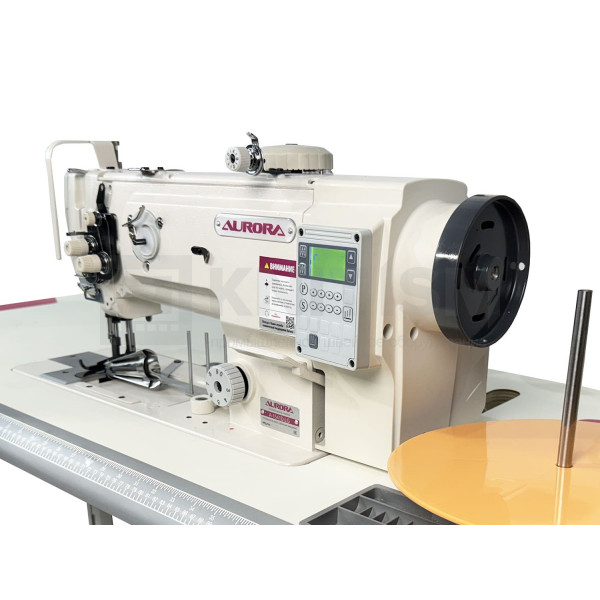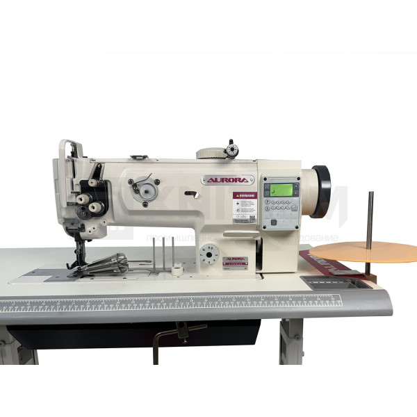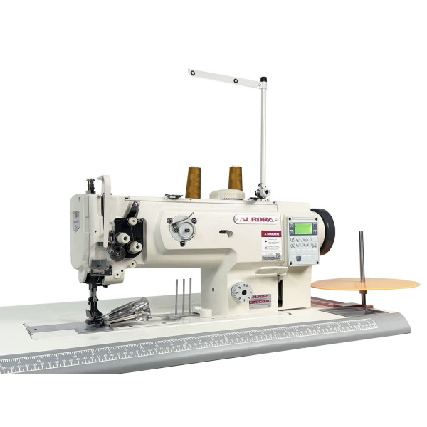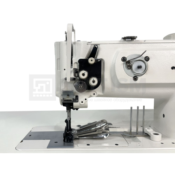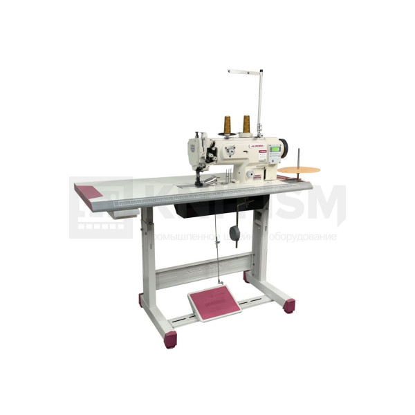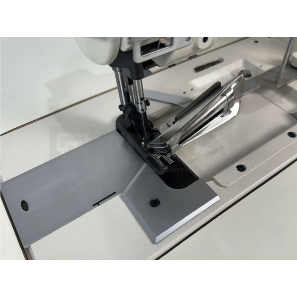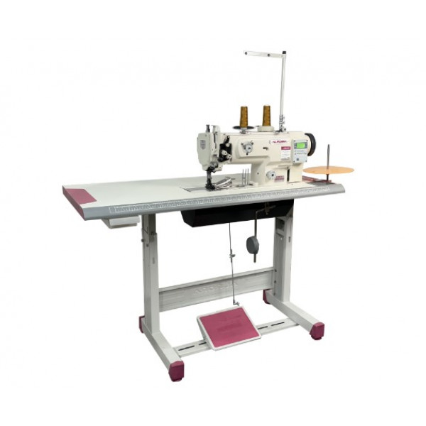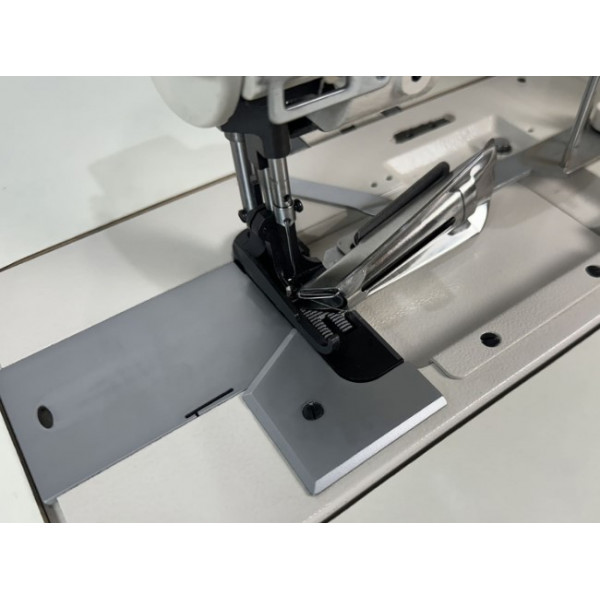 Прямострочная одноигольная машина с унисонной подачей материала, подвижным окантователем, увеличенным вертикальным челноком и прямым приводом.