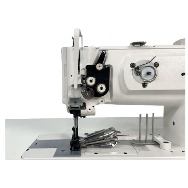 Прямой привод обеспечивание плавную работы машины; Автоматическая смазка; Подвижная платформа для окантователя с змеевидной направляющей для бейки; Стойка для подачи бейки; Надежную беспосадочную подачу материала обеспечивают два синхронных двигателя материала: нижняя зубчатая рейка и шагающая лапка. Игла за все время подачи не выходит из материала, причем ее горизонтальная скорость равна скорости подачи материала на всей длине стежка. Это обеспечивает выполнение шва высокого качества без посадки слоев друг относительно друга.
