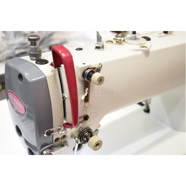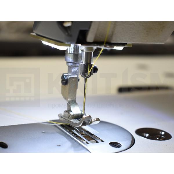 Одноигольная прямострочная машина двухниточного челночного стежка с игольным продвижением для шитья средних и тяжелых материалов. Прямой привод обеспечивает плавный старт и возможность регулировки скорости шитья. Позиционер иглы позволяет задать верхнее или нижнее положение иглы после остановки шитья. Игольное продвижение совместно с нижней транспортирующей рейкой предотвращают сдвиг слоев, исключают посадку и сборение материала.