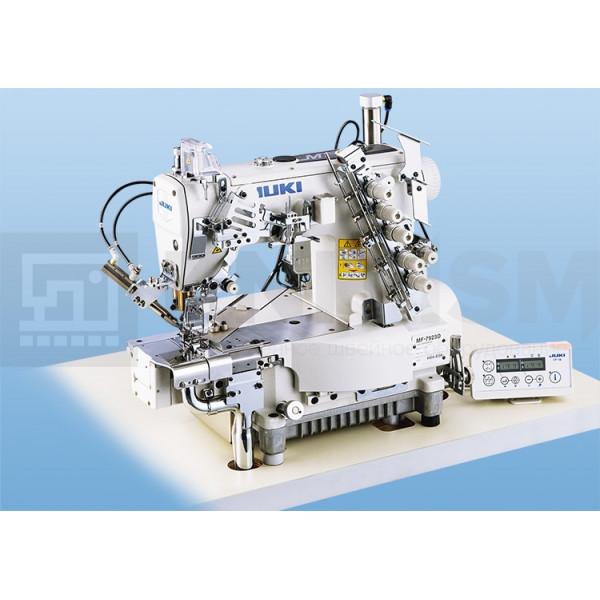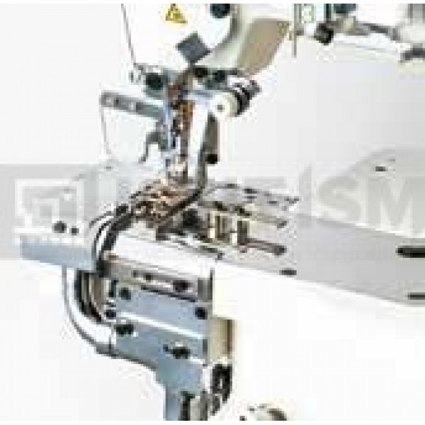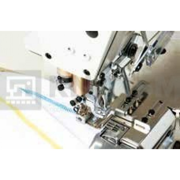 Трехигольная пятиниточная плоскошовная машина с цилиндрической платформой, устройством для подгибки и устройством для подрезки края материала чаще всего используется для подшивания рукава и подгибания низа футболки при изготовлении трикотажной и спортивной одежды.