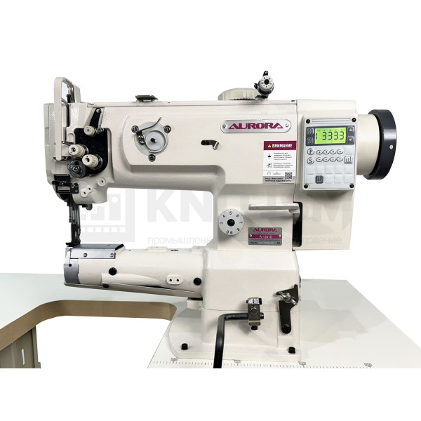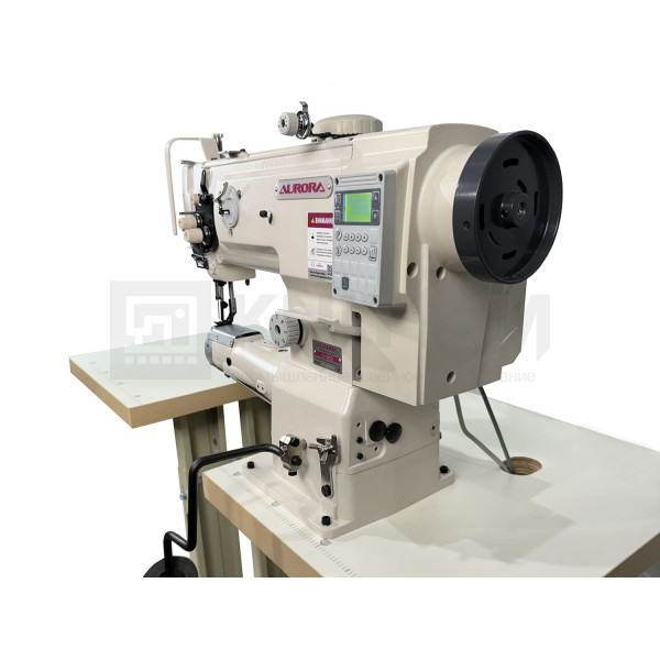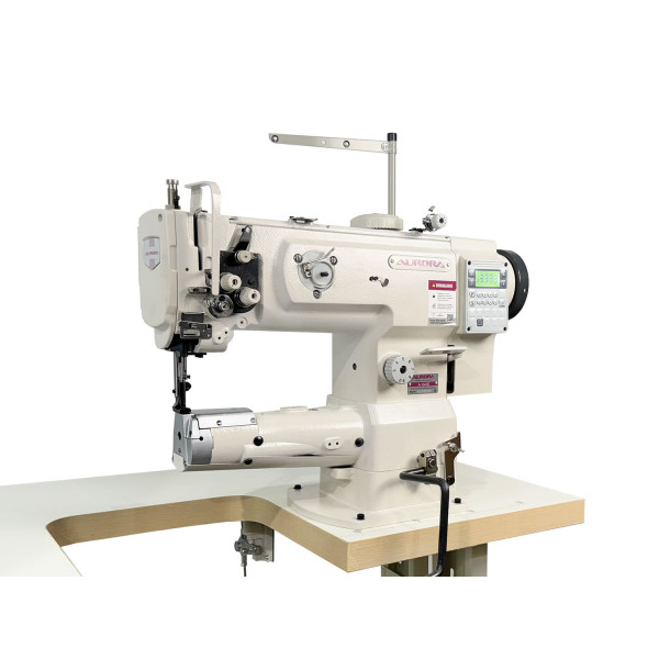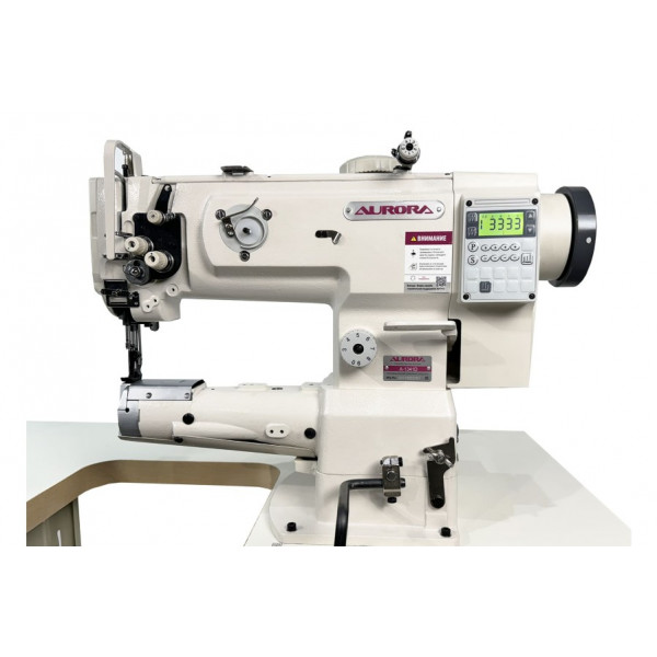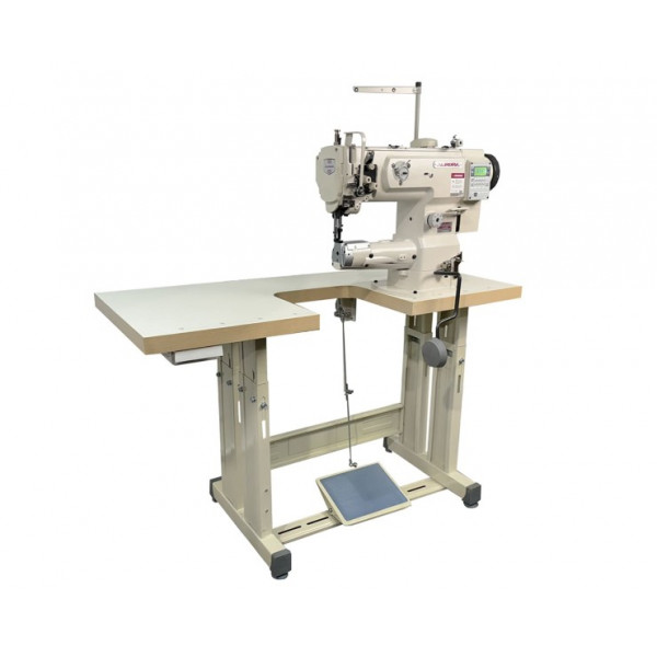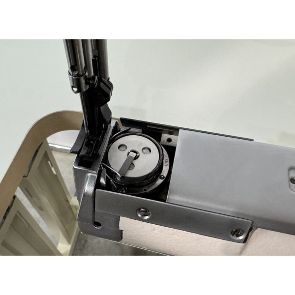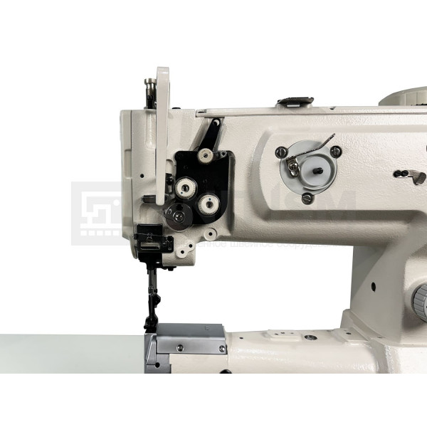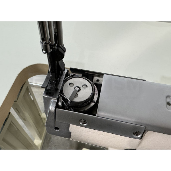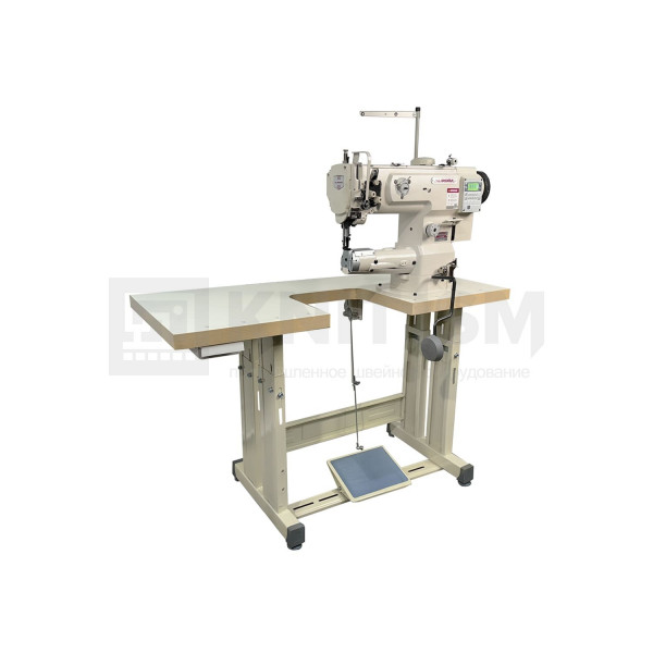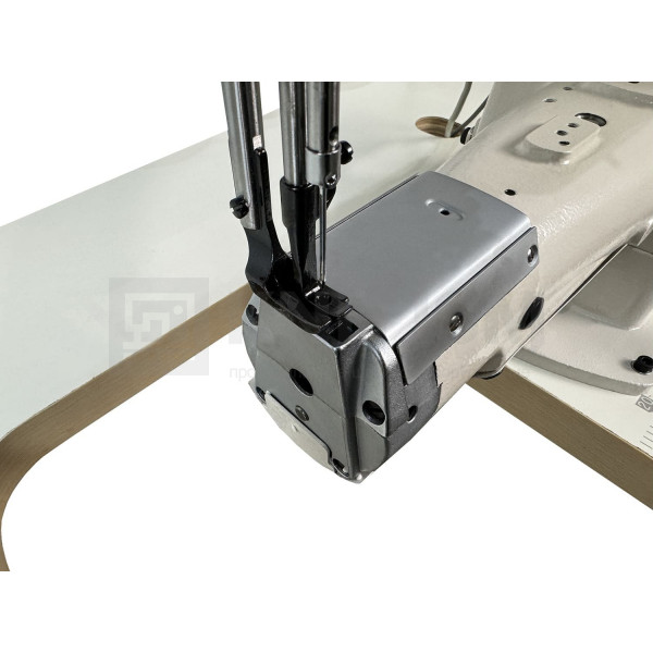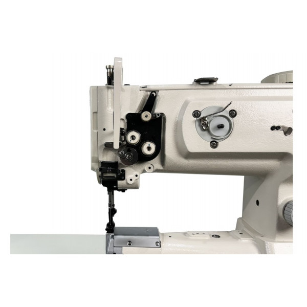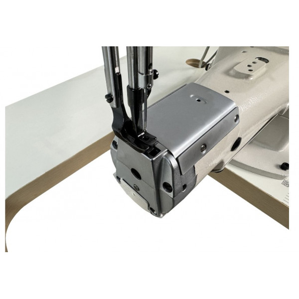 Одноигольная швейная машина челночного стежка с платформой рукавного типа и тройным (унисонным) продвижением материала, прямым приводом и увеличенным челноком.