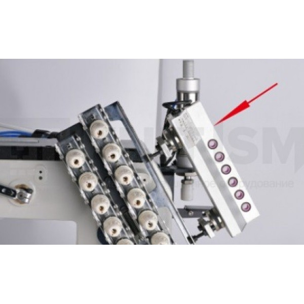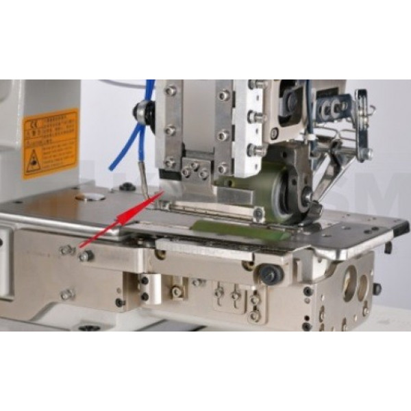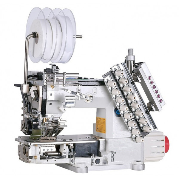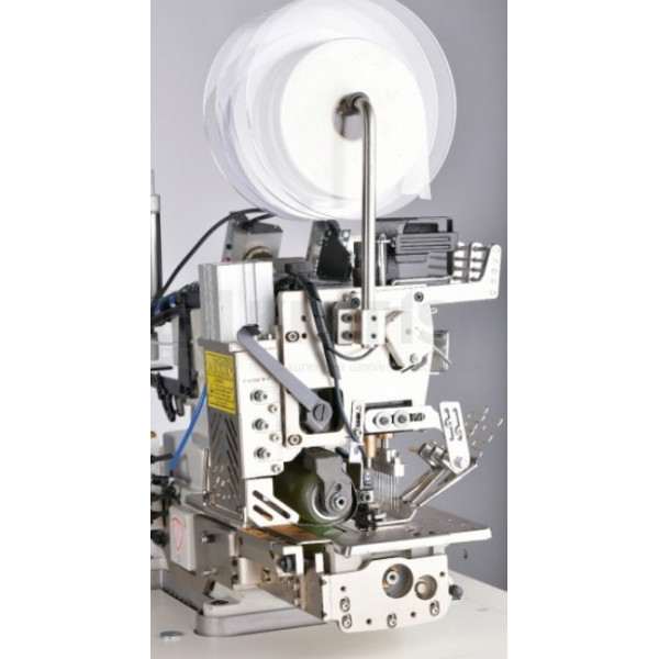 Высокоскоростная поясная 12-ти игольная промышленная швейная машина двухниточного цепного стежка с цилиндрической платформой,с устройством подачи трех лент одновременно, автоматической обрезкой нити и подъемом лапки и задним пуллером с функцией автоматической обрезки лент.