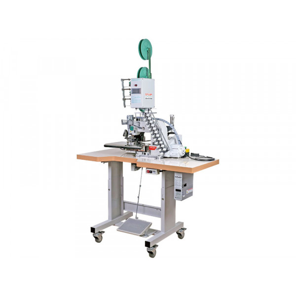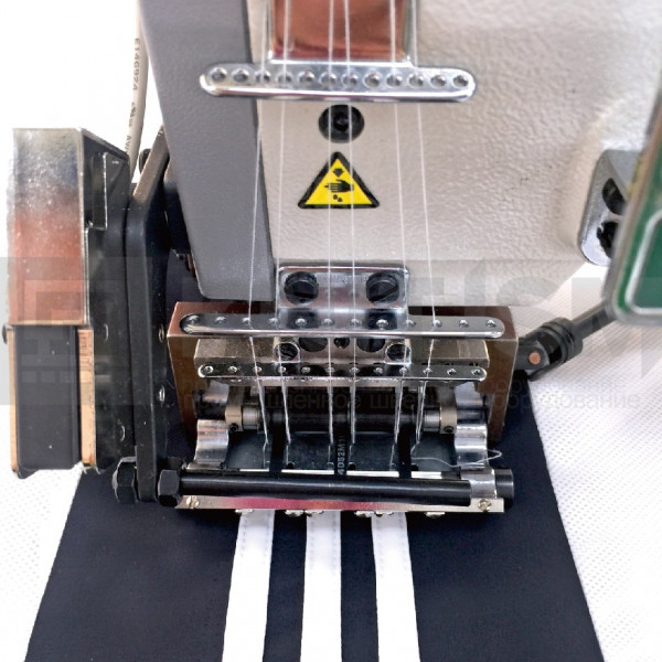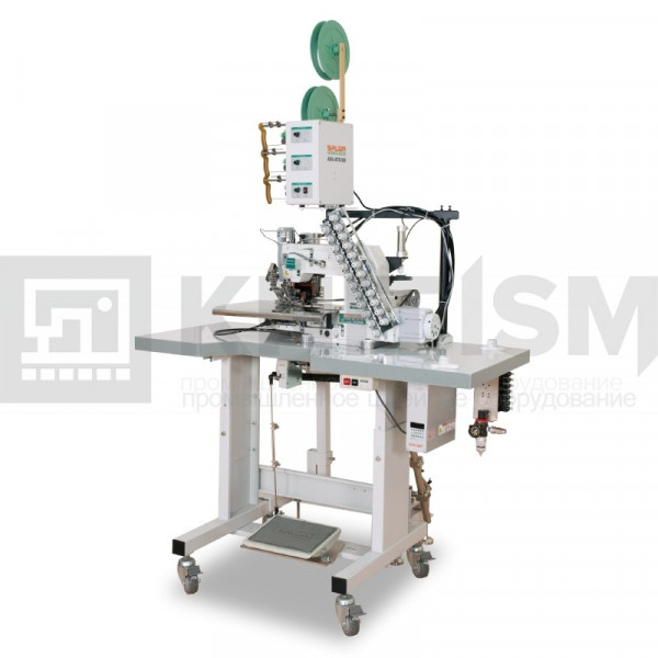 Оснащенное рабочее место на базе 6-ти игольной машины двухниточного цепного стежка VC008-06064P/VPL с устройством дозированной подачи лент, устройством автоматической обрезки лент и укладчиком изделий предназначено для притачивания лампас при пошиве спортивных костюмов.
