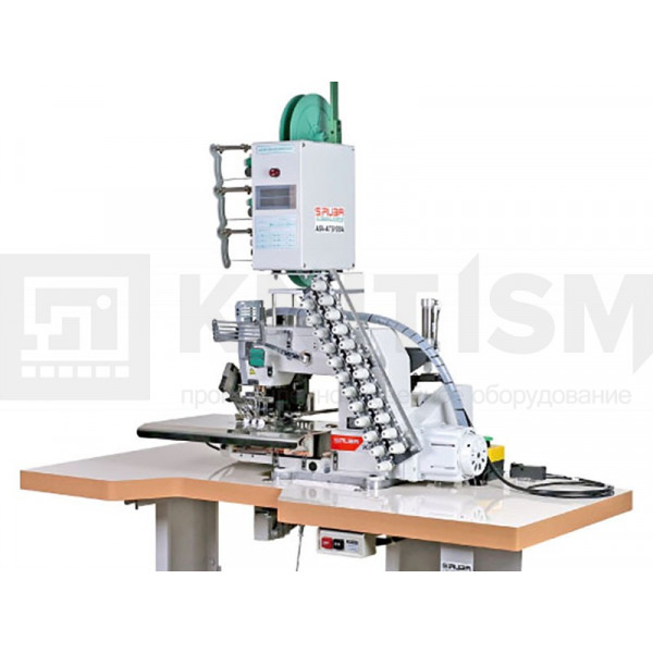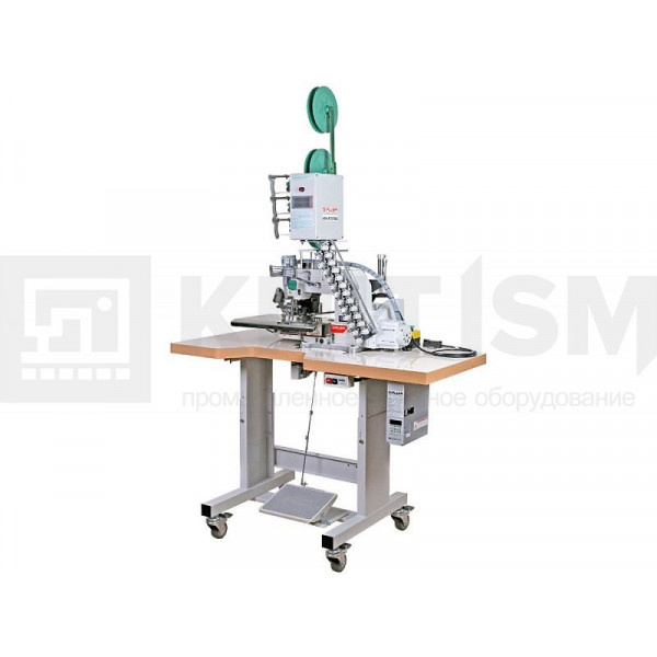 Оснащенное рабочее место на базе 6-ти игольной машины двухниточного цепного стежка VC008-06064P/VPL с устройством дозированной подачи лент, устройством автоматической обрезки лент и укладчиком изделий предназначено для притачивания лампас при пошиве спортивных костюмов.