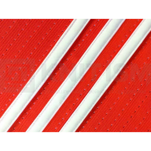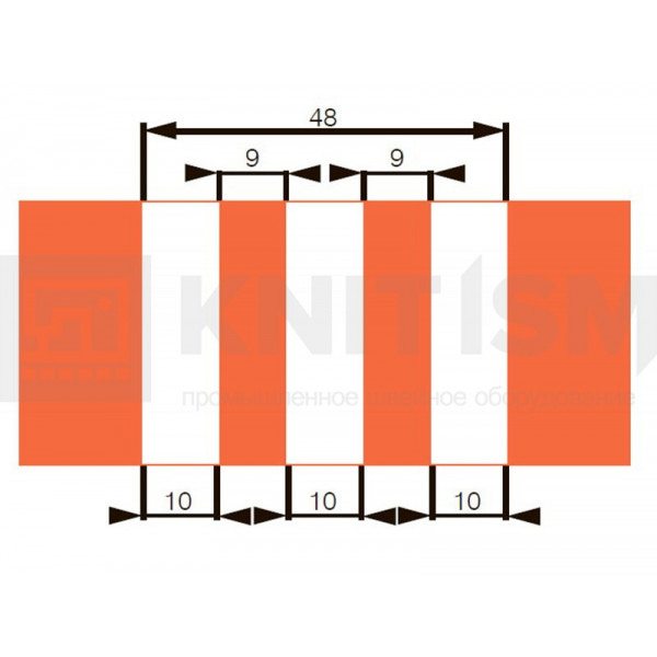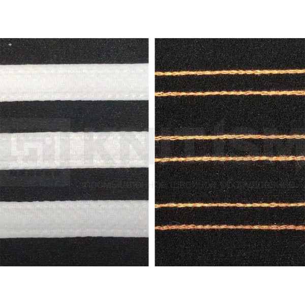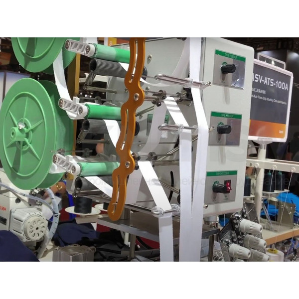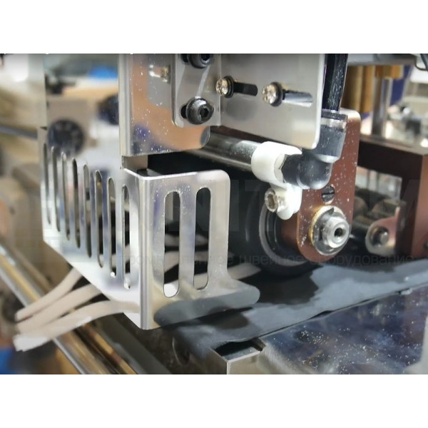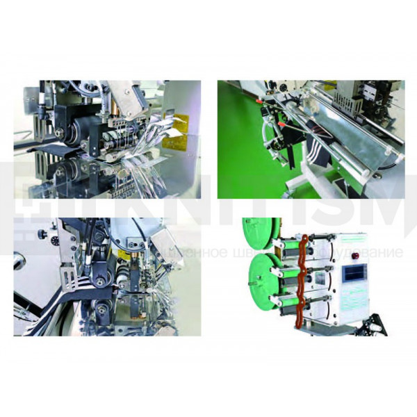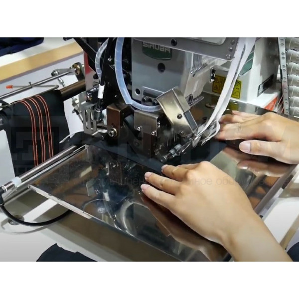 Используется специальная прижимная лапка для шитья трех полосок тесьмы. Лапка имеет регулировку, чтобы шитье происходило без складок. Рабочая станция позволяет автоматизировать и упростить операцию по притачиванию лампас благодаря устройству автоматической обрезки лент с электрическим датчиком-контроллером, сокращающим расход материала, и укладчику изделий. Минимальная длина готового изделия: 150 мм. Подача тесьмы контролируется отдельными двигателями для повышения производительности.