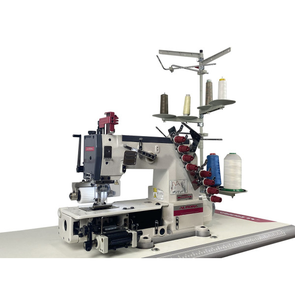 4-х игольная машина цепного стежка с цилиндрической платформой (поясная машина), задним роликом продвижения (пуллером) и встроенным в головку сервоприводом. Предназначена для притачивания эластичной ленты (резинки) с устройством её дозированной подачи. Применяется в производстве трикотажных и текстильных изделий: мужское белье, шорты, спортивная одежда, спецодежда и т.д.