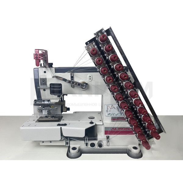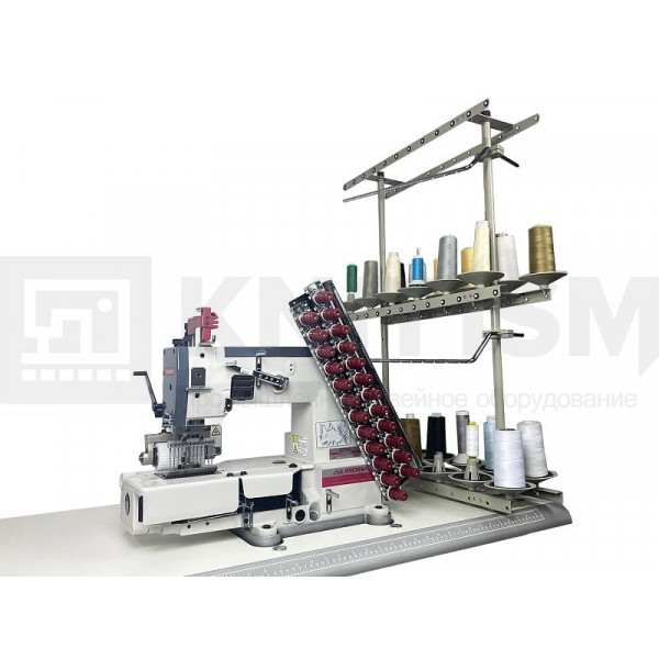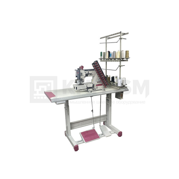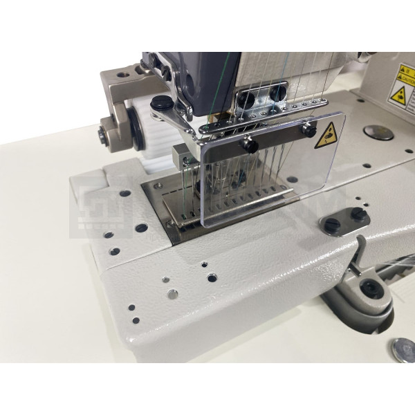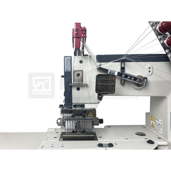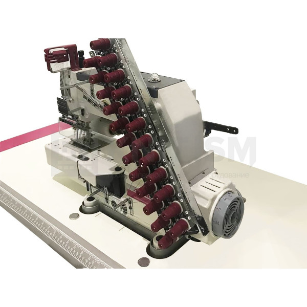 12-ти игольная машина цепного стежка с цилиндрической платформой (поясная машина), задним роликом продвижения (пуллером) и встроенным в головку сервоприводом. Предназначена для обработки поясов изделий, декоративной обработки и притачивания эластичной ленты (резинки), предварительно сшитой в кольцо (при выборе опции RL), к трикотажным и текстильным изделиям: мужское белье, шорты, спортивная одежда, спецодежда и т.д.