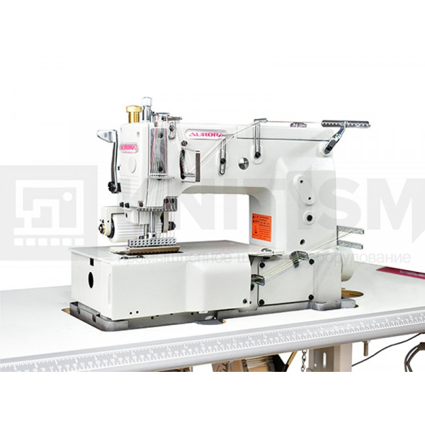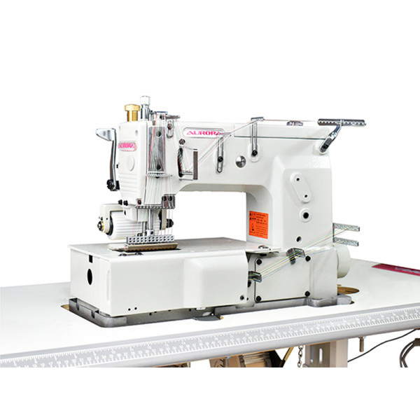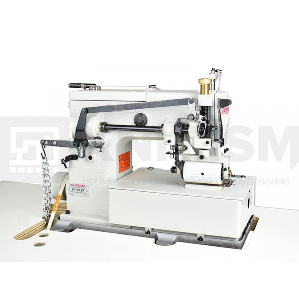 12-и игольная машина двухниточного цепного стежка с плоской платформой и задним пуллером. Предназначена для обработки поясов спортивной одежды и других трикотажных изделий. Имеет задний зубчатый пластиковый пуллер для продвижения материала.