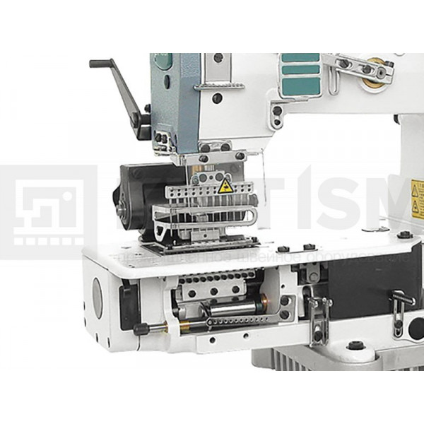 Удержание эластичной нити под столом делает процесс шитья более плавным. Расстояние между иглами можно изменить путем замены комплекта. Задний пуллер помогает в продвижении материала. Цилиндрическая платформа обеспечивает возможность пошива изделий по замкнутому контуру.