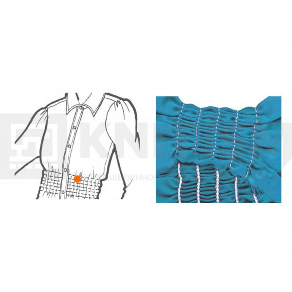 Декоративная сборка выполняется при помощи эластичных нитей, заправленных в петлители (в иглах используются обычные нити) на женской и детской одежде из легких и средних по толщине тканей и трикотажа.