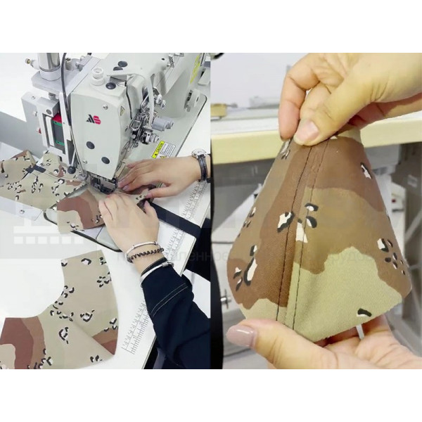 Автоматизированное решение на базе двухигольной машины с игольным продвижением, прямым приводом, позиционером иглы, автоматической обрезкой закрывающей тесьмы. Машина предназначена для закрытия шва стачивания клиньев бейсболки, кепки.